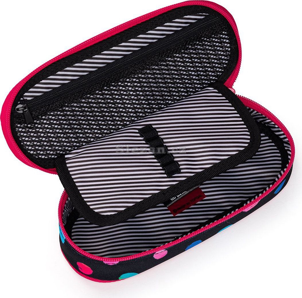 Uvnitř pouzdra je síťová kapsička na zip a klopa, na níž jsou umístěny gumičky pro uchycení celkem devíti tužek a propisek, které je potřeba mít přehledně uspořádané a po ruce.