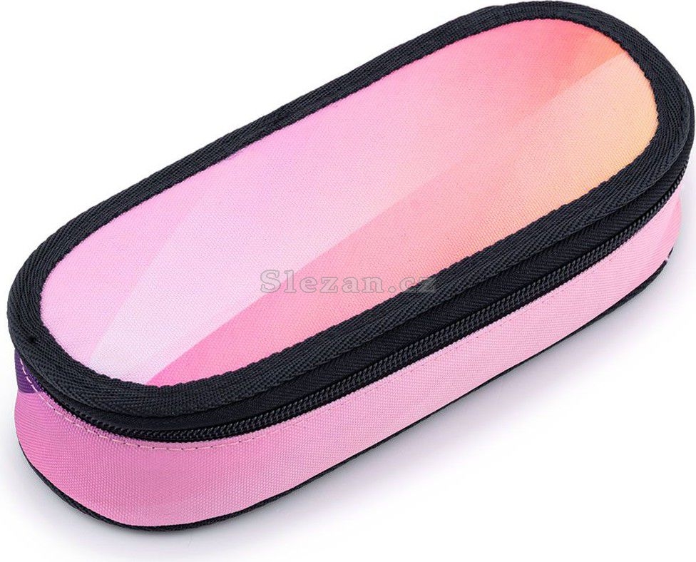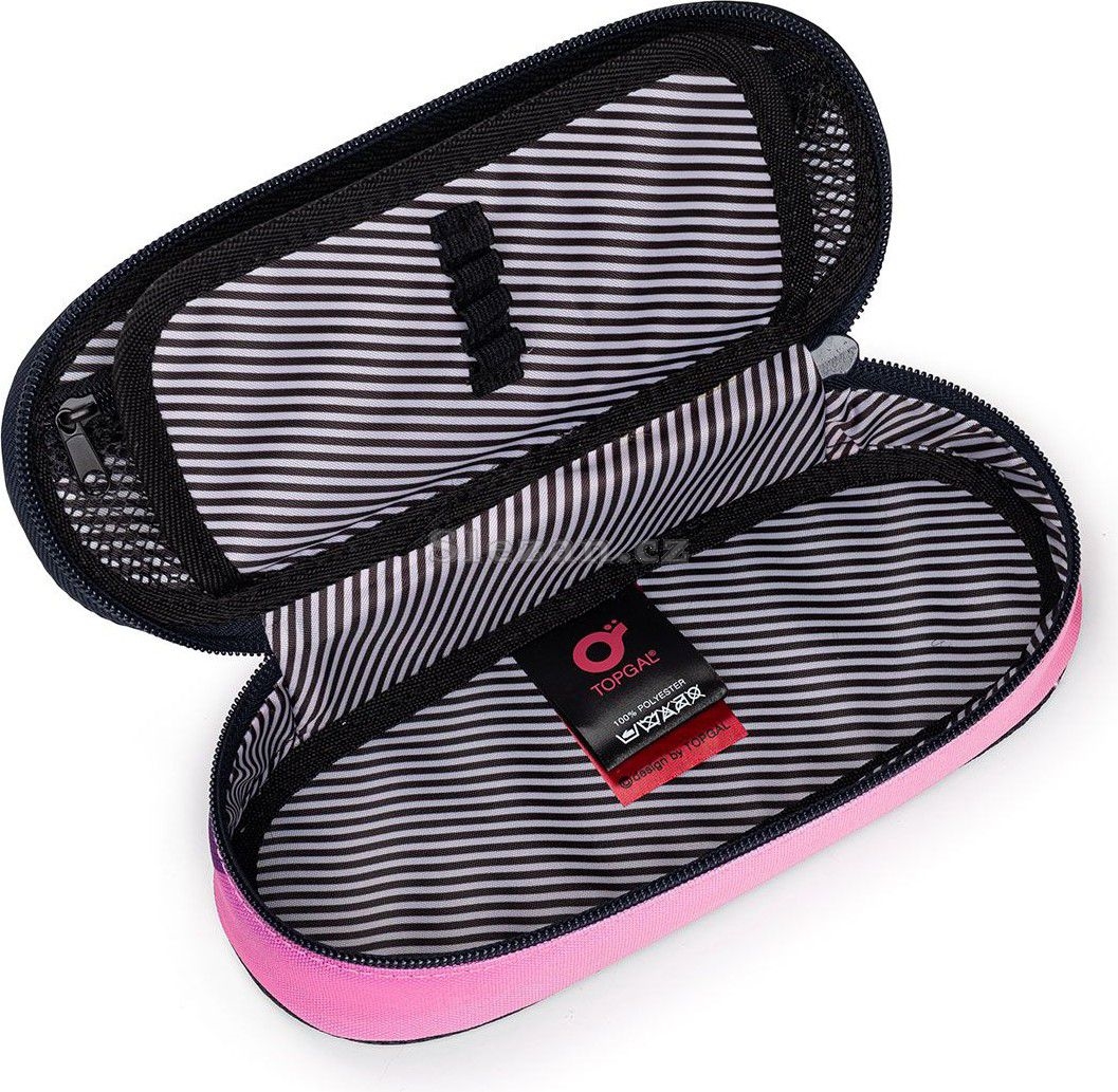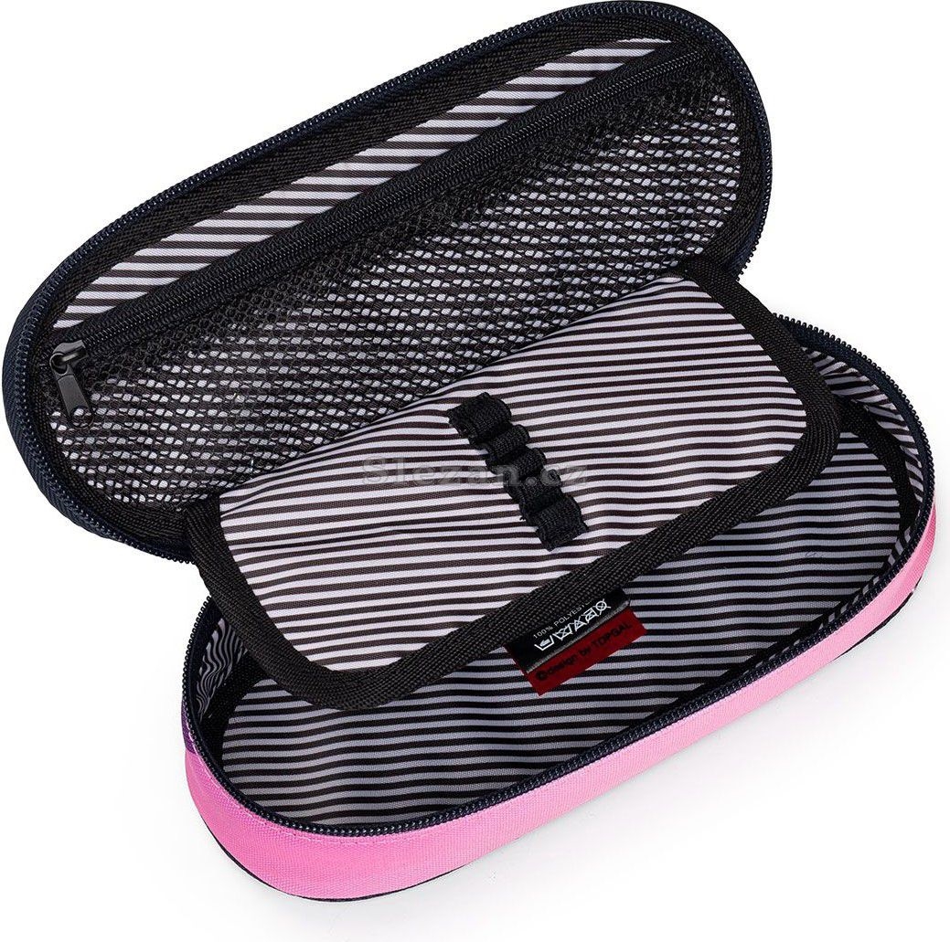 Oválný penál pro všechny potřebnosti. Uvnitř pouzdra je síťová kapsička na zip a klopa, na níž jsou umístěny gumičky pro uchycení celkem devíti tužek a propisek, které je potřeba mít přehledně uspořádané a po ruce. Volný prostor pod klopou pak umožňuje volně umístit další psací potřeby – pastelky, fixy, prostě cokoliv potřebujete.