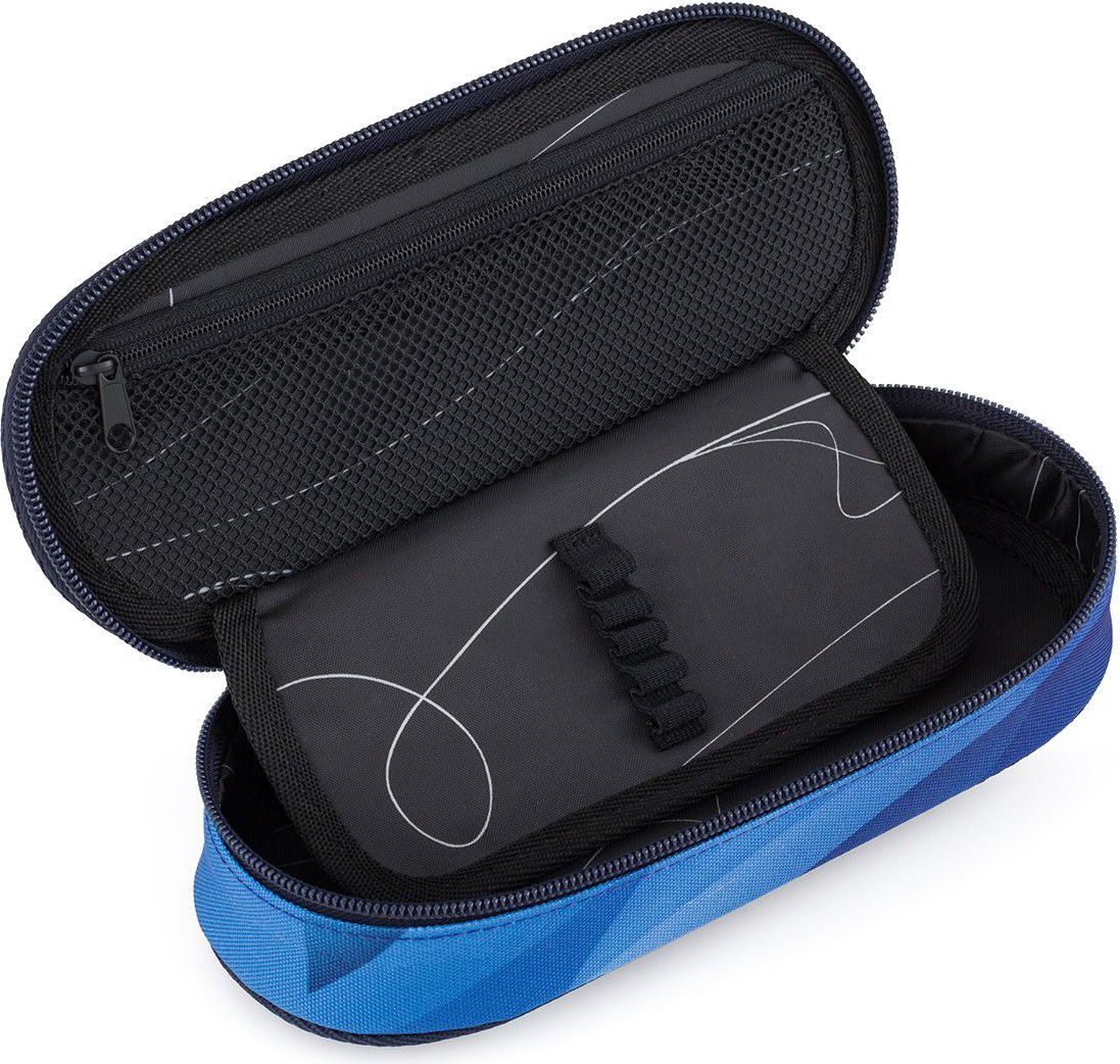 Oválný penál pro všechny starší školáky a studenty. Uvnitř pouzdra je síťová kapsička na zip a klopa s devíti gumičkami na propisky. Volný prostor pod klopou slouží pro další psací potřeby – pastelky, fixy, ale i pravítko nebo kružítko.