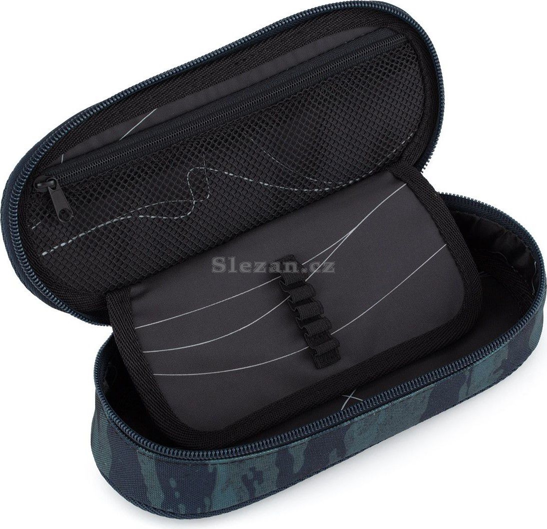Oválný penál pro všechny starší školáky a studenty. Uvnitř pouzdra je síťová kapsička na zip a klopa s devíti gumičkami na propisky. Volný prostor pod klopou slouží pro další psací potřeby – pastelky, fixy, ale i pravítko nebo kružítko.