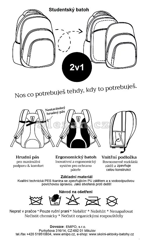 Studentský batoh 2v1 DANIEL je dvoudílný a čtyřkomorový. Dvoudílný (2v1) znamená, že zip u druhé komory jde buď úplně rozepnout a tím se rozdělí batoh na dva. Vzniklý větší má zádovou část s polstrováním a ergonomickým systémem pro ochranu páteře.