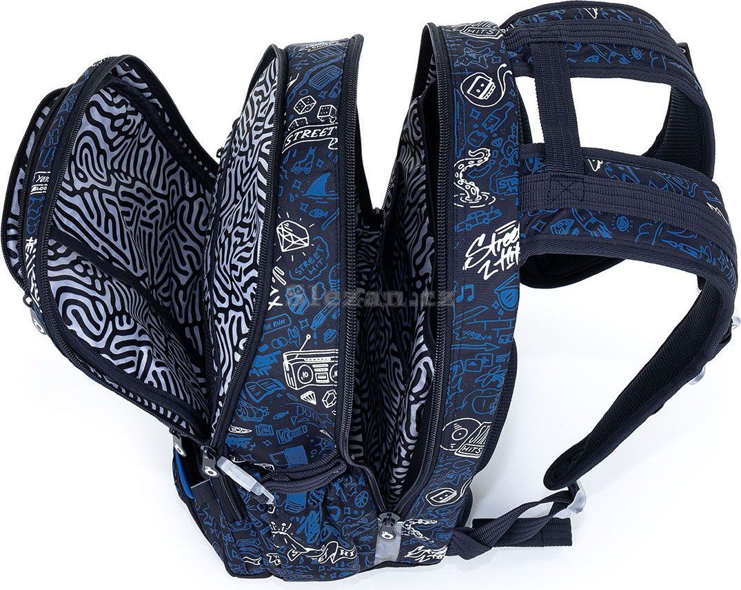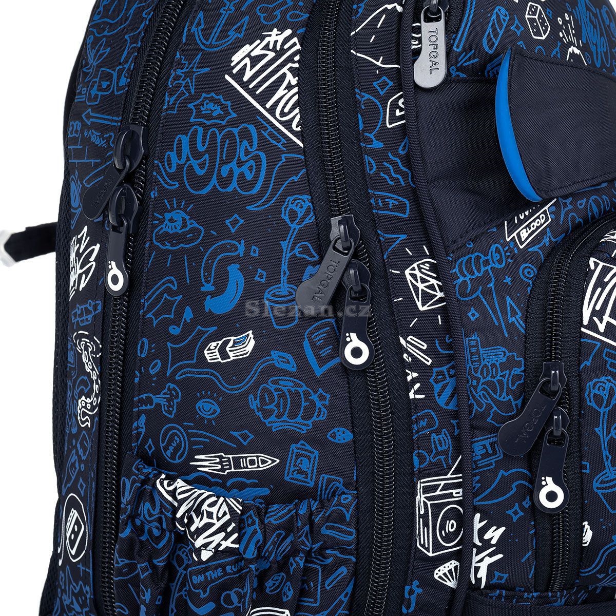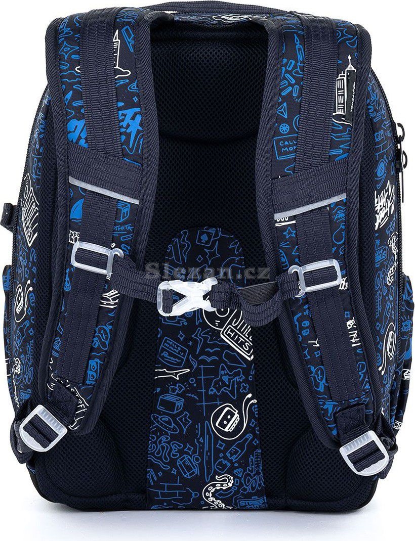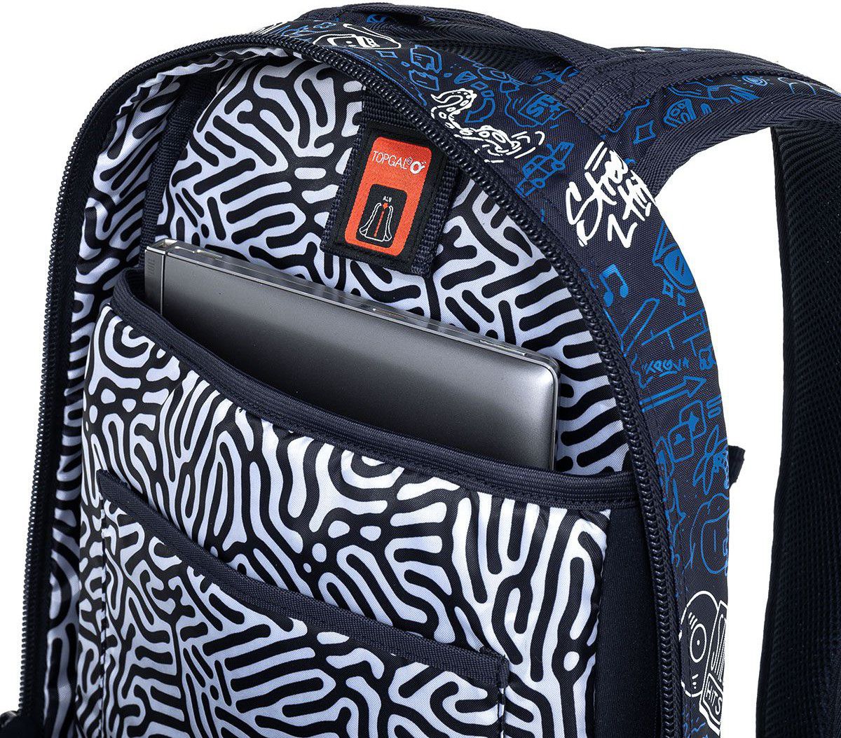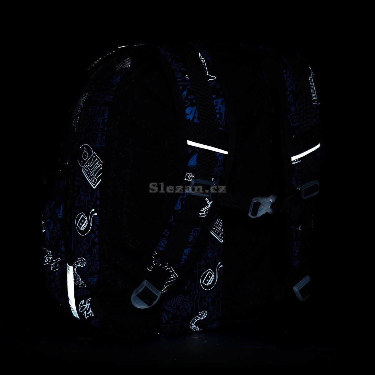 Objemný dvoukomorový batoh s módními doodle art obrázky. Záda batohu jsou polstrovaná, anatomicky tvarovaná a pevná díky lehké hliníkové výztuze. Uvnitř zadní komory je umístěna polstrovaná kapsa na notebook i tablet a druhá menší na mobil či powerbanku.