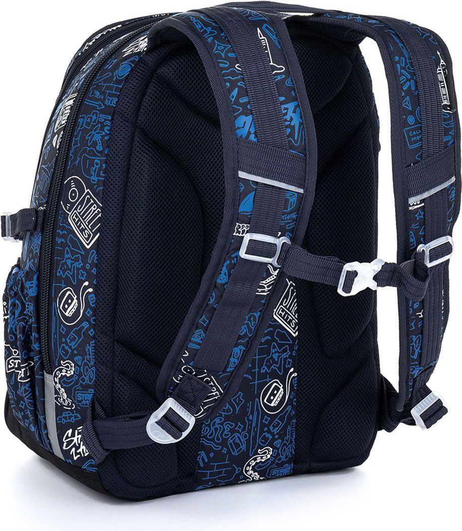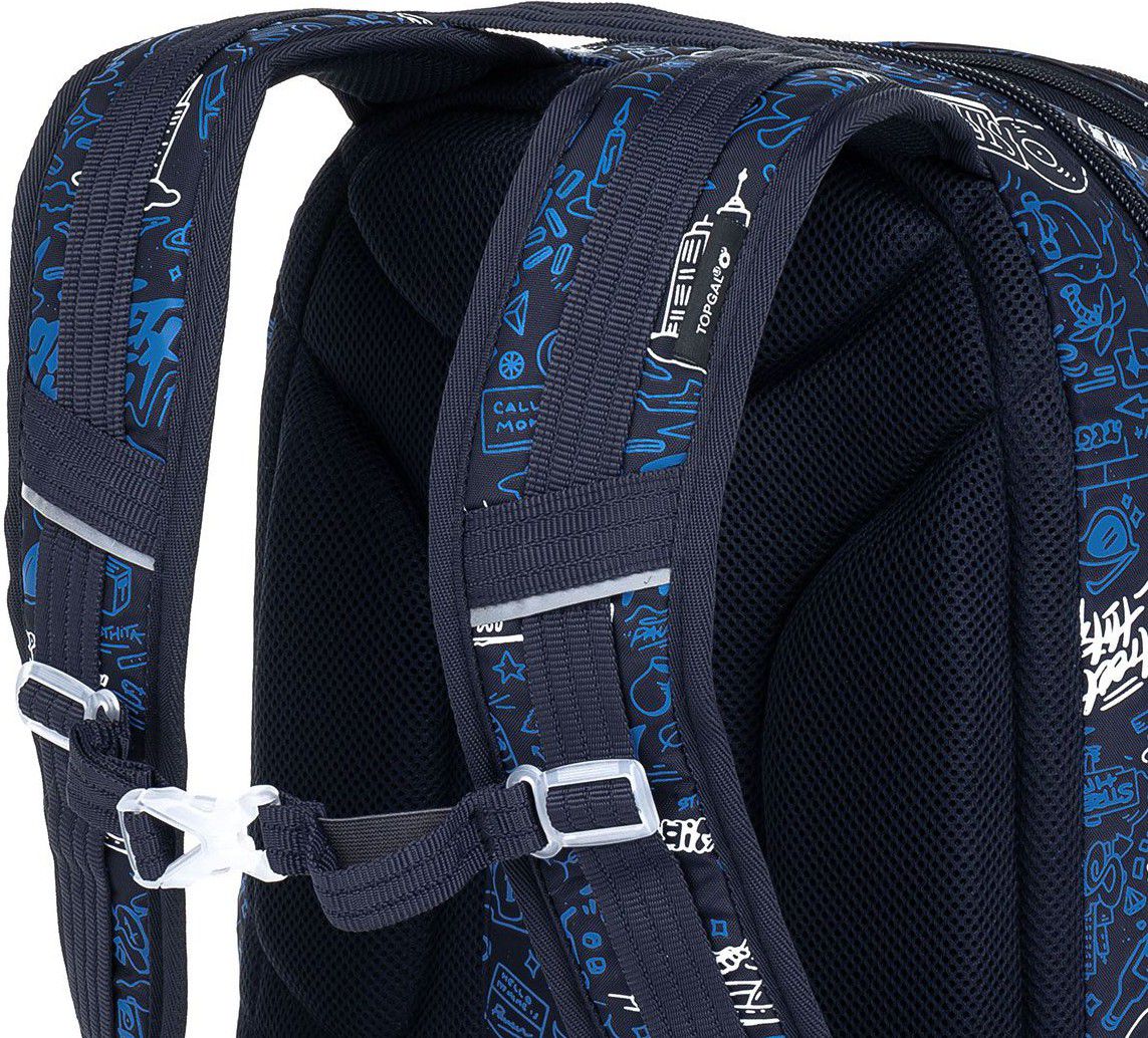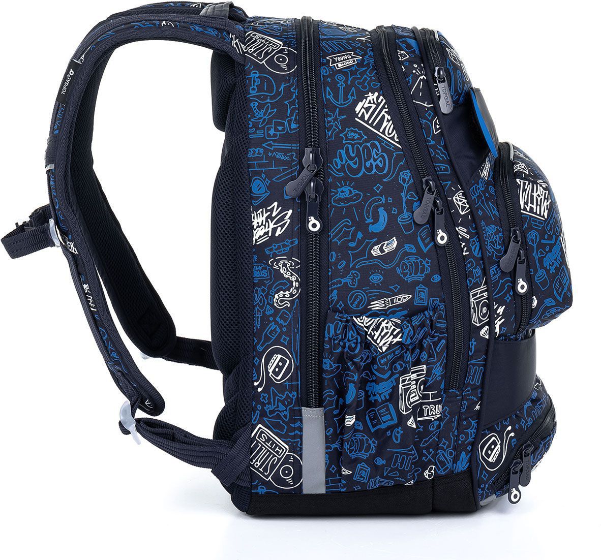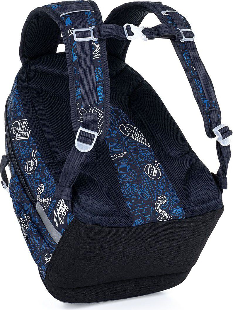 Objemný dvoukomorový batoh s módními doodle art obrázky. Záda batohu jsou polstrovaná, anatomicky tvarovaná a pevná díky lehké hliníkové výztuze. Uvnitř zadní komory je umístěna polstrovaná kapsa na notebook i tablet a druhá menší na mobil či powerbanku.