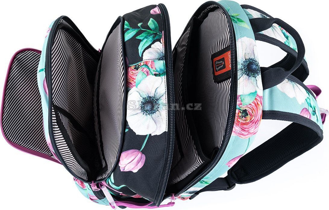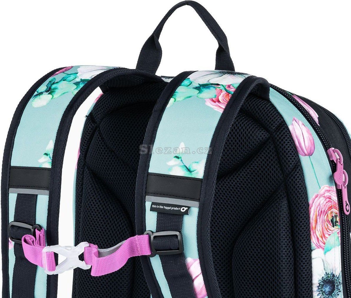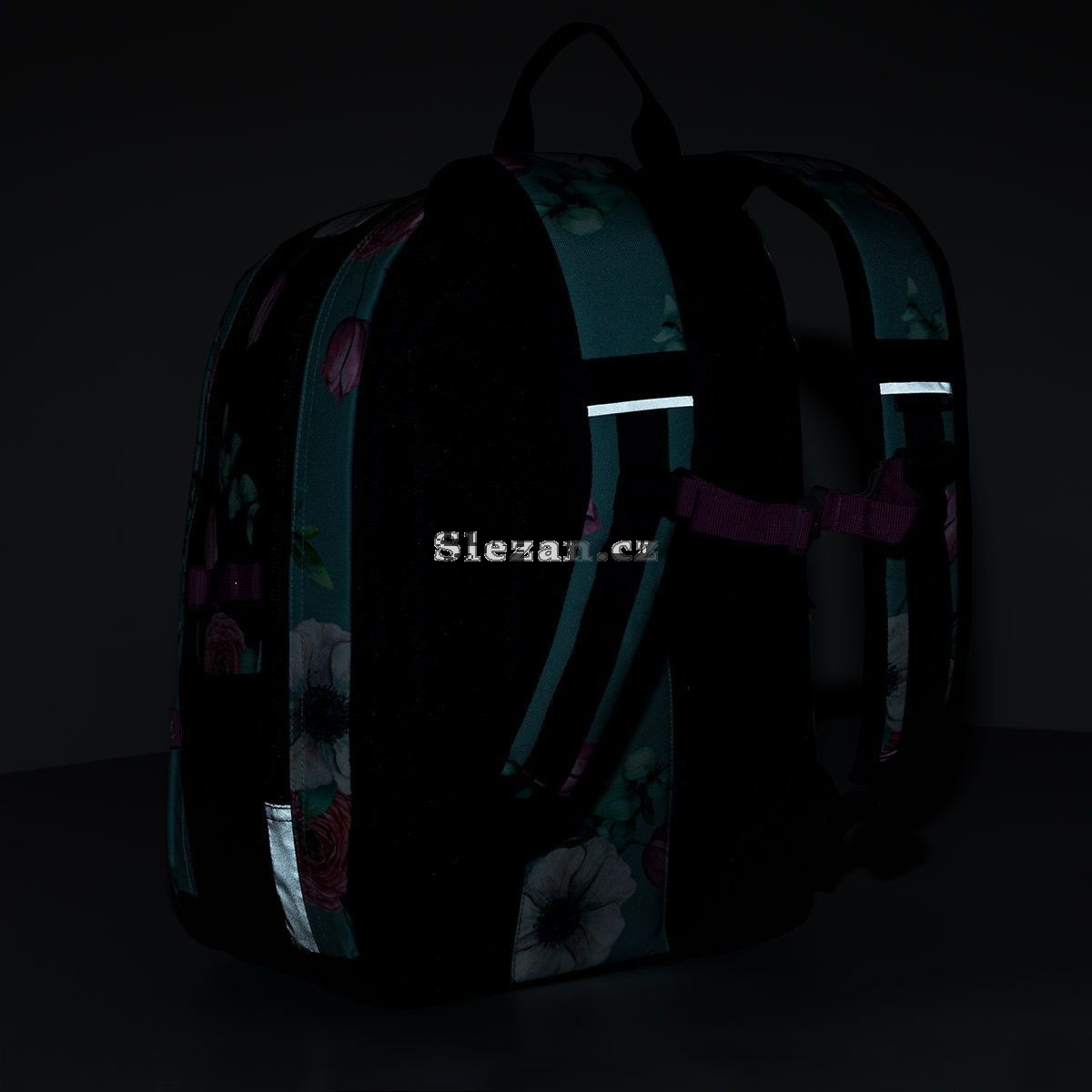 Pevná polstrovaná záda s výztuhou vhodný od 2. stupně ZŠ/150 cm výšky nastavitelné ramenní popruhy a hrudní přezka Dvoukomorový sedumadvacetilitrový objemný batoh s dvěma předními kapsičkami je ideální společník na druhý stupeň ZŠ, SŠ, VŠ, ale i na volný čas.