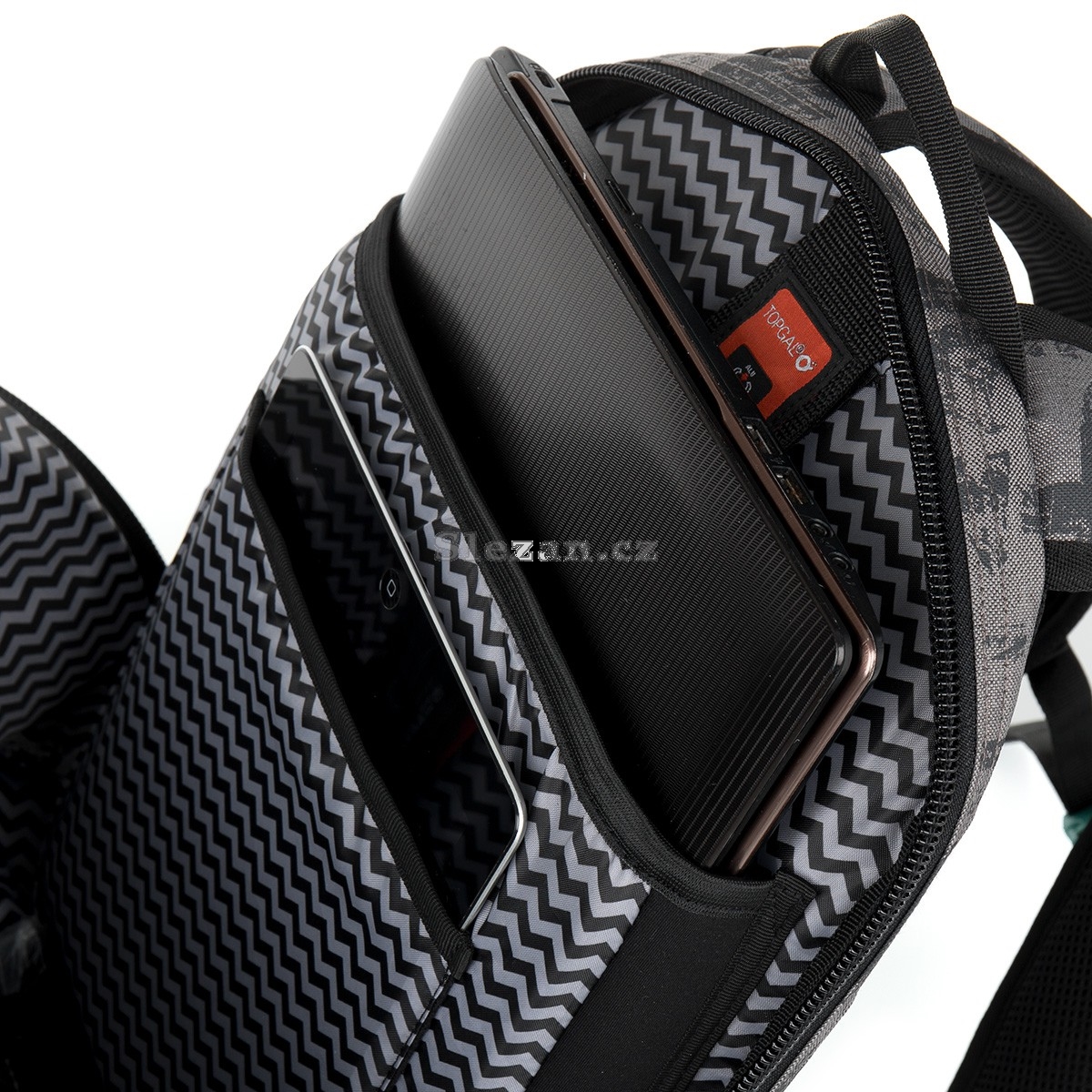 Zadní komora je objemná, vejde se do ní vše – učebnice nebo těžké desky na sešity. Navíc je v ní ukrytá polstrovaná kapsa na notebook (do velikosti 15,4”) a na této kapse ještě menší polstrovaná kapsička třeba na tablet. V přední komoře je praktická síťová kapsa na zip, která se skvěle hodí na mobil, peněženku nebo na čipové karty. Na přední část batohu jsme pod potištěnou přední část přidali ještě praktickou kapsu. Na oba boky batohu jsme pak všili síťové kapsy na lahve s pitím. Pravá je doplněna o stahovací pásek, který se hodí na připevnění větší lahve o objemu 1,5 litru.