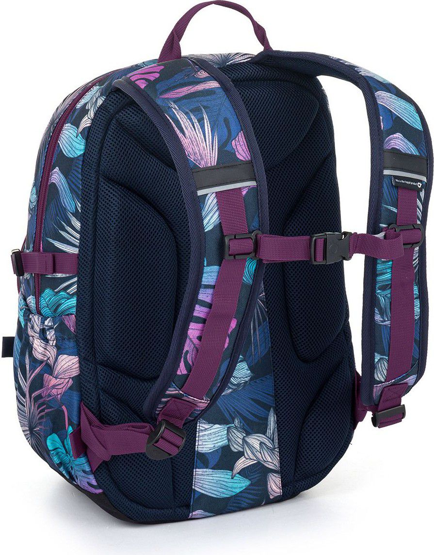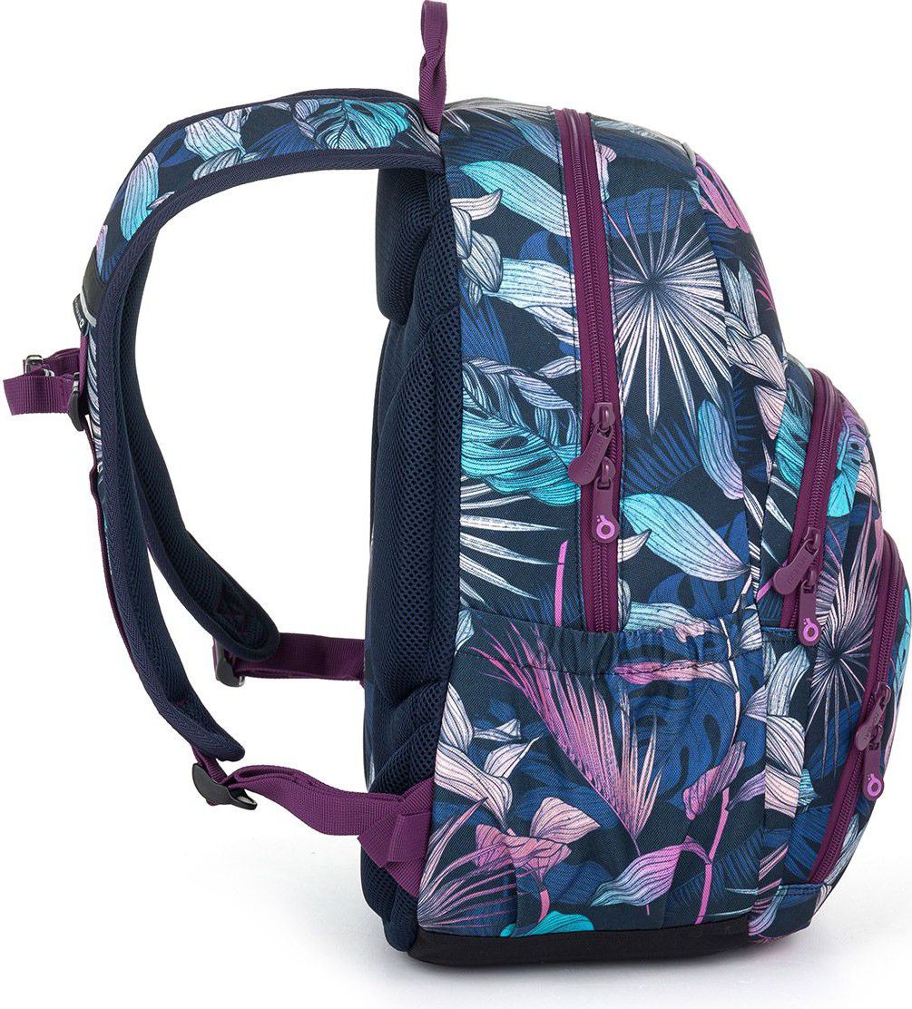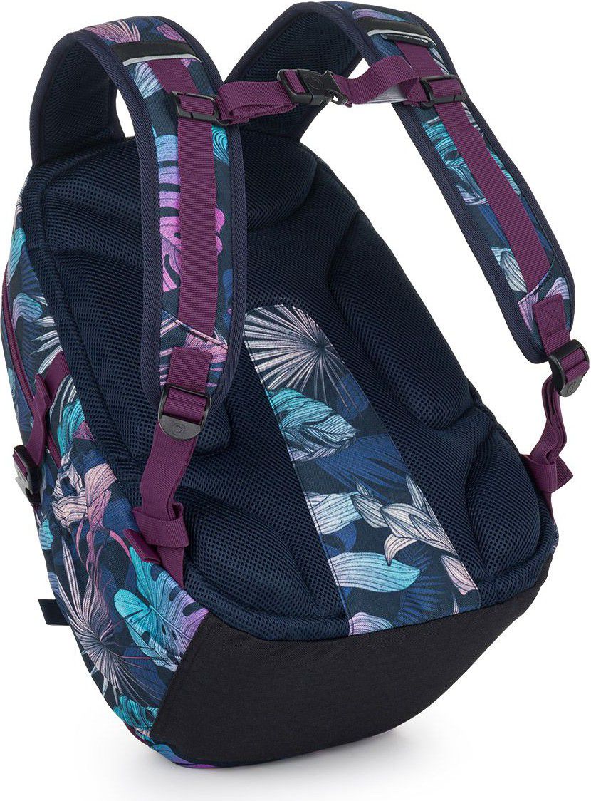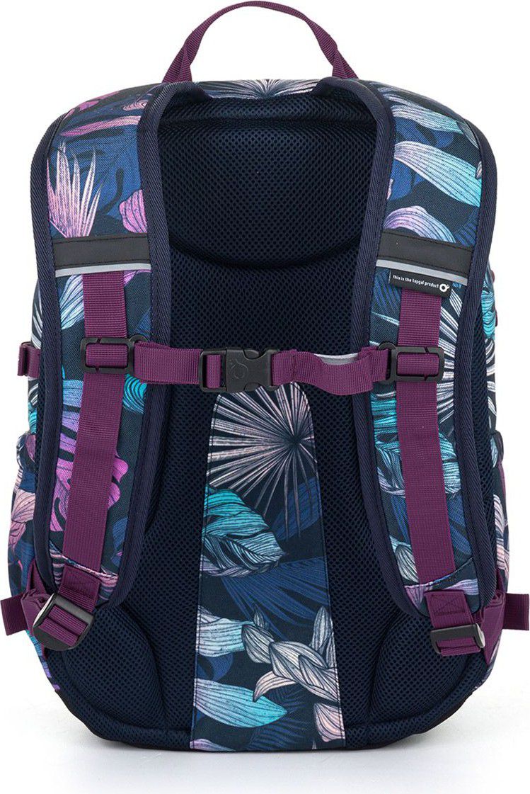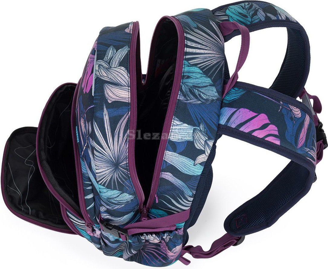 Jednokomorový batoh s barevnými listy monstery a stylovou nášivkou. Záda batohu jsou polstrovaná, anatomicky tvarovaná s lehkou hliníkovou výztuhou. Uvnitř komory je umístěna polstrovaná kapsa na notebook, klíčenka a síťovaná kapsa na zip.