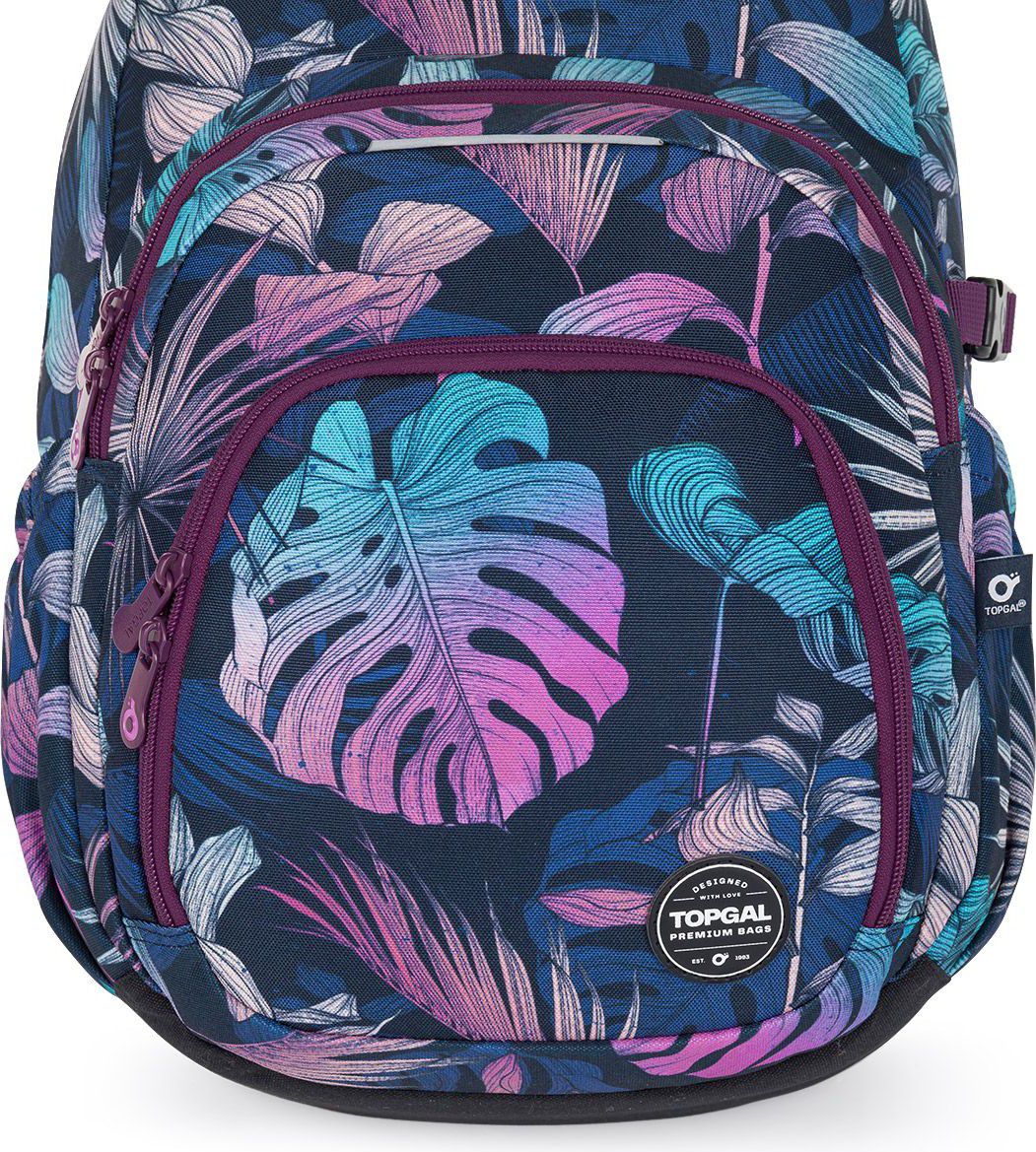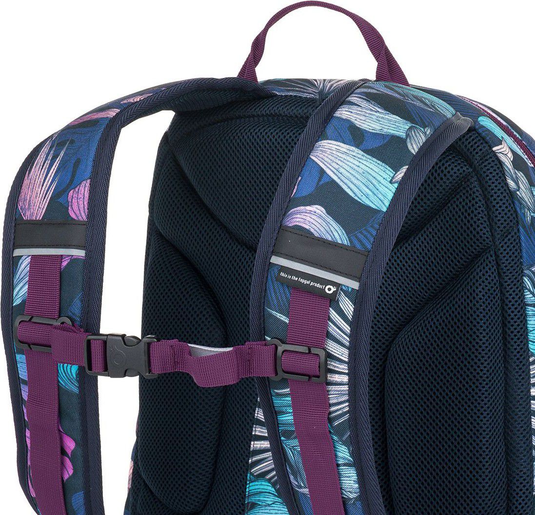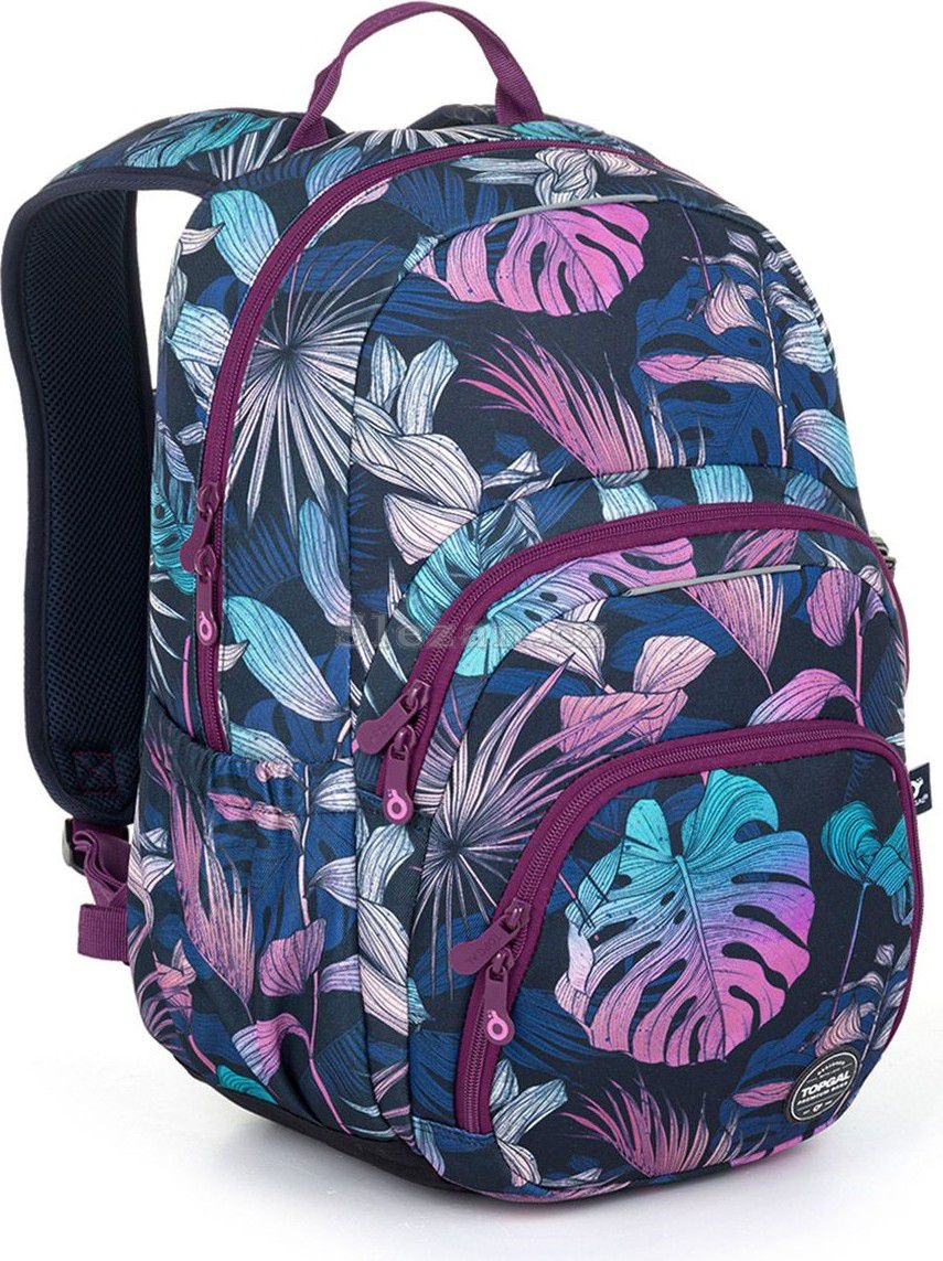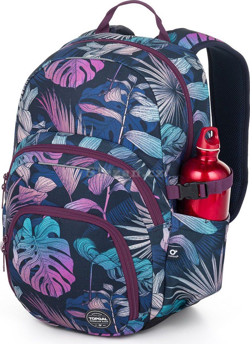 Jednokomorový batoh s barevnými listy monstery a stylovou nášivkou. Záda batohu jsou polstrovaná, anatomicky tvarovaná s lehkou hliníkovou výztuhou. Uvnitř komory je umístěna polstrovaná kapsa na notebook, klíčenka a síťovaná kapsa na zip.