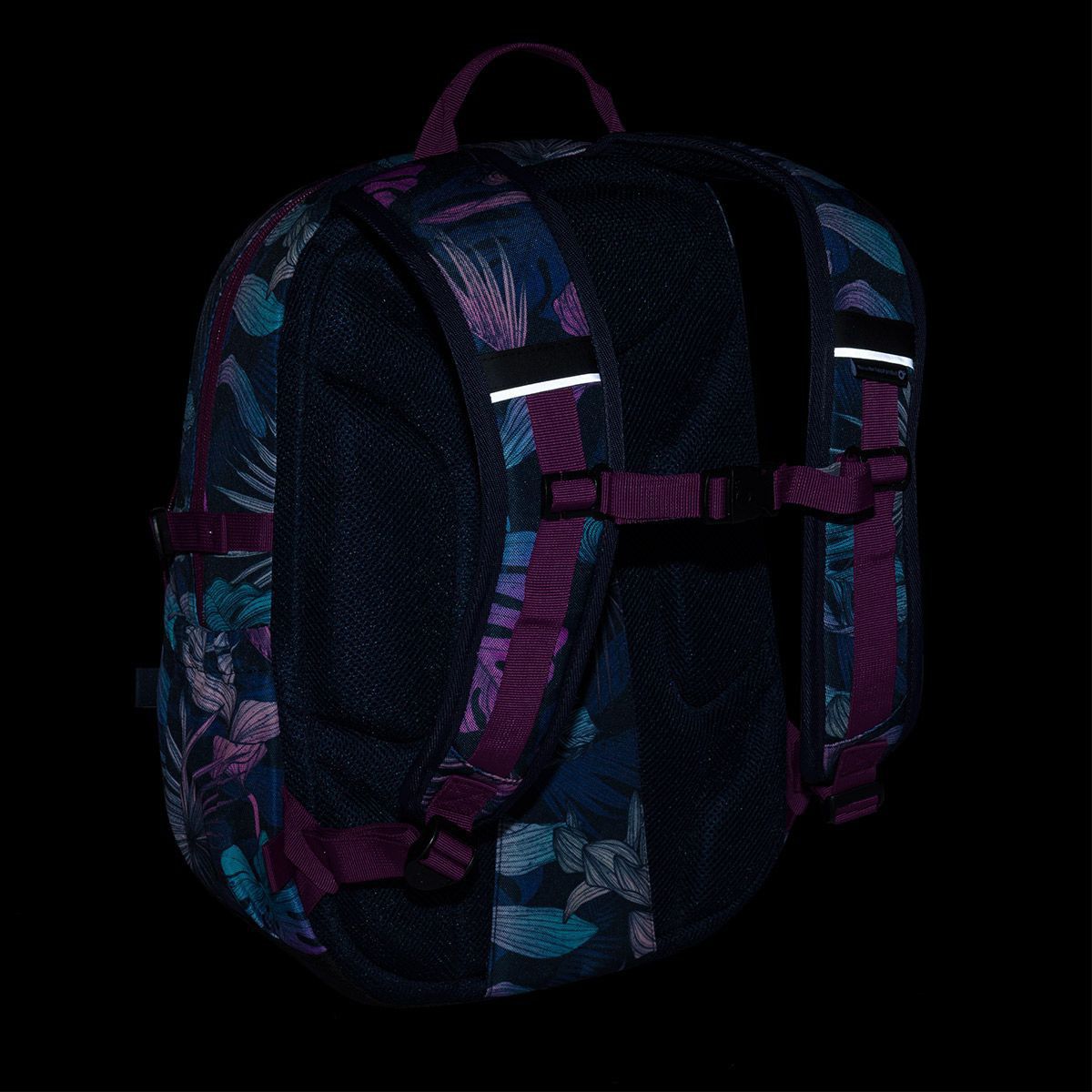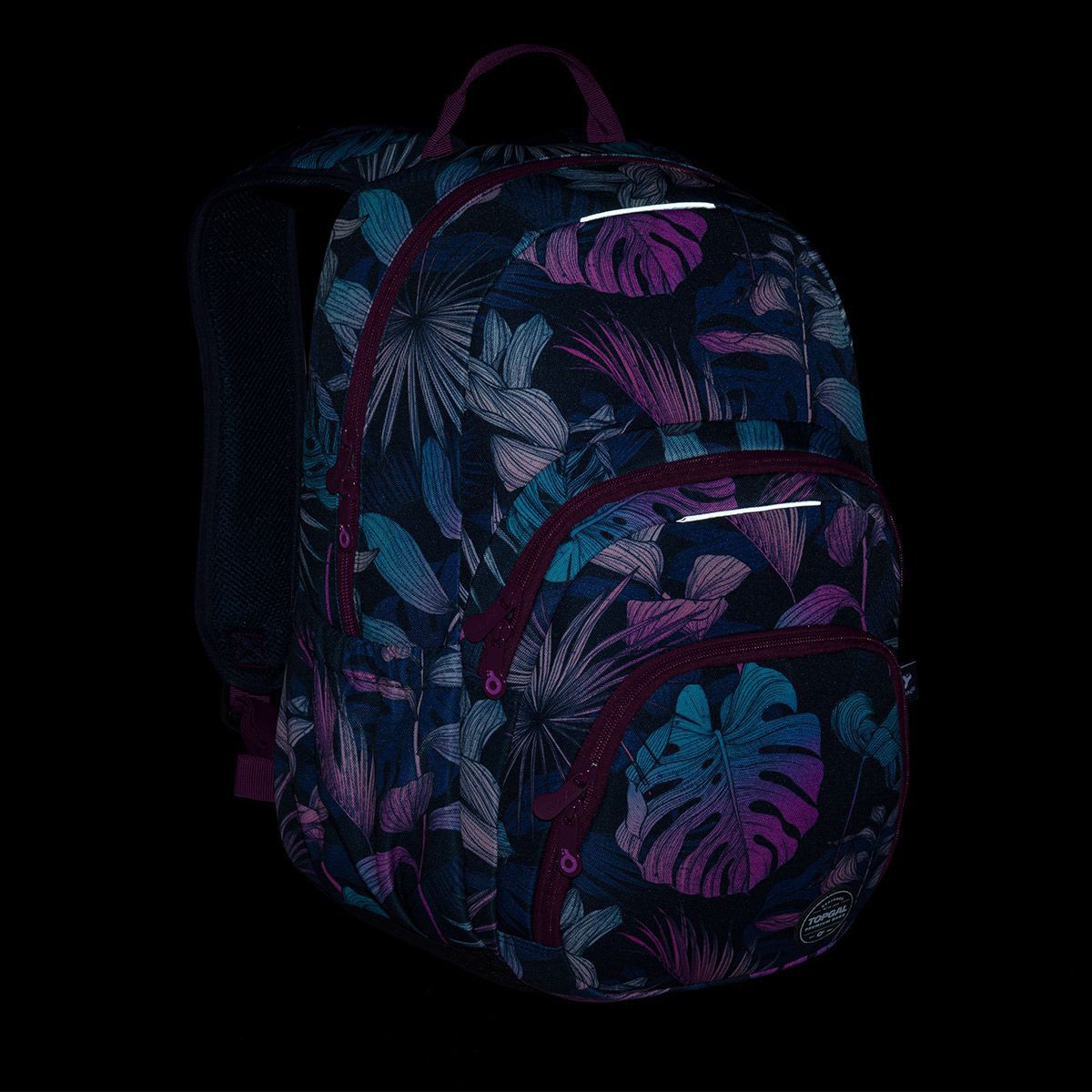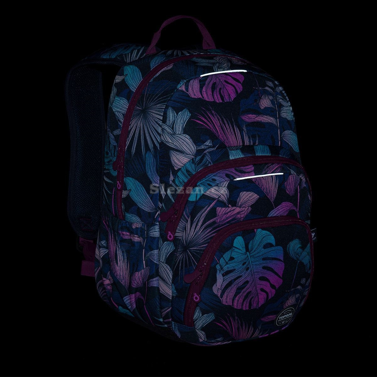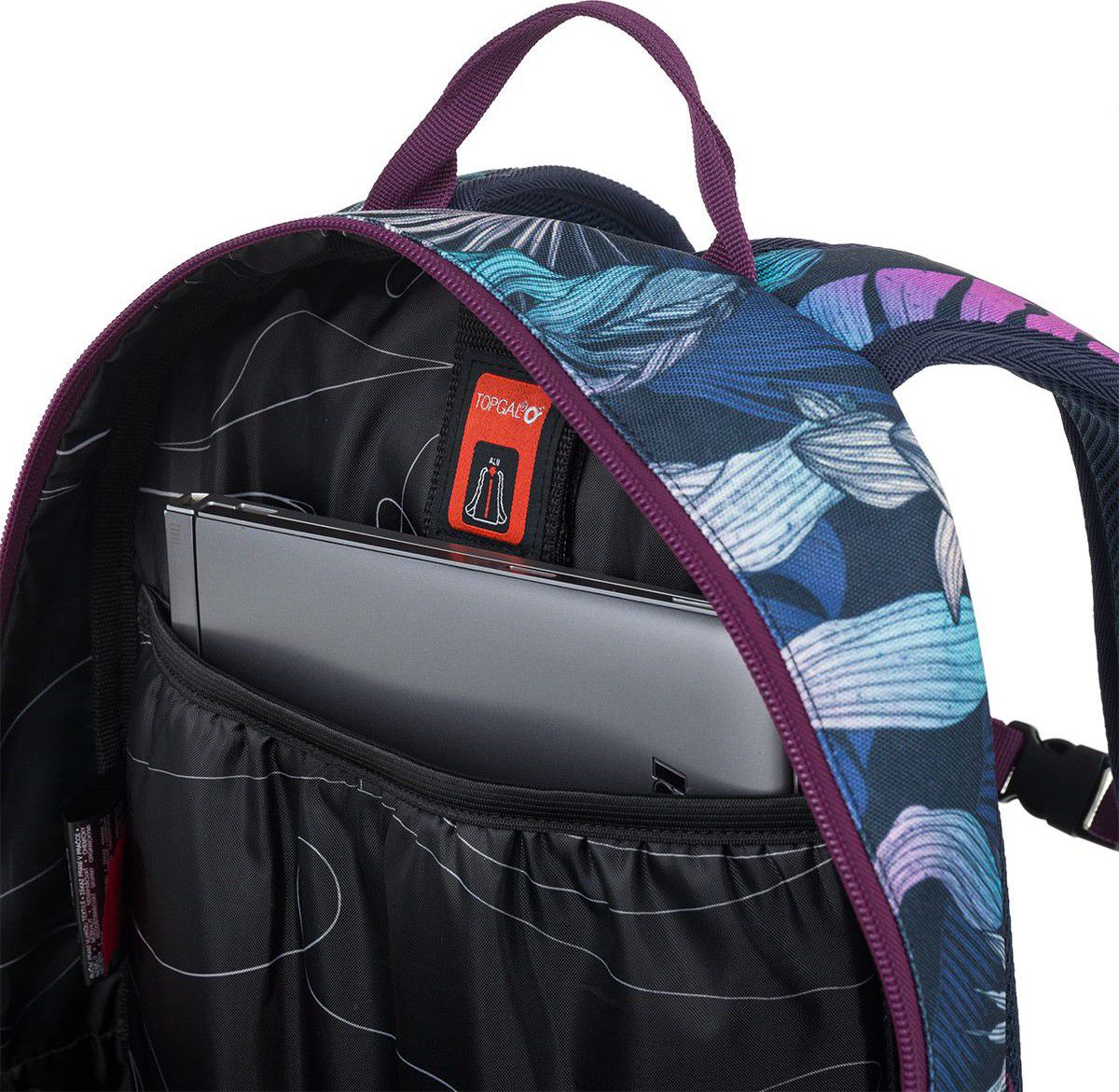 Jednokomorový batoh s barevnými listy monstery a stylovou nášivkou. Záda batohu jsou polstrovaná, anatomicky tvarovaná s lehkou hliníkovou výztuhou. Uvnitř komory je umístěna polstrovaná kapsa na notebook, klíčenka a síťovaná kapsa na zip.