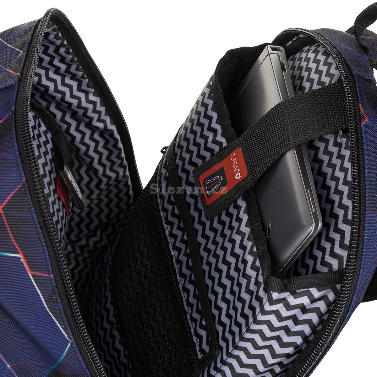 Zadní komora batohu je nejobjemnější. Najdete v ní polstrovanou kapsu pro bezpečné uložení notebooku do maximální velikosti 15,4”, který můžete upevnit páskem na suchý zip. Pokud do školy notebook nenosíte, nevadí. Kapsu můžete využít na přenášení složek, dokumentů nebo jiných písemností. Na polstrované kapse je pak našita ještě jedna malá síťovaná kapsa na zip, určená na drobnosti, nebo třeba na mobil.