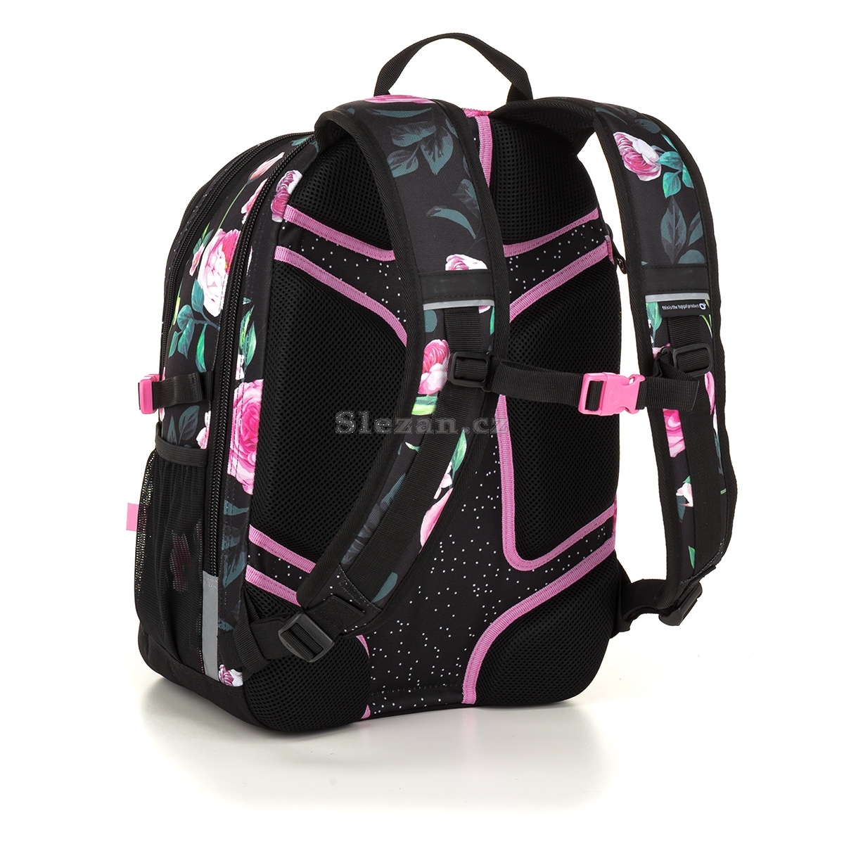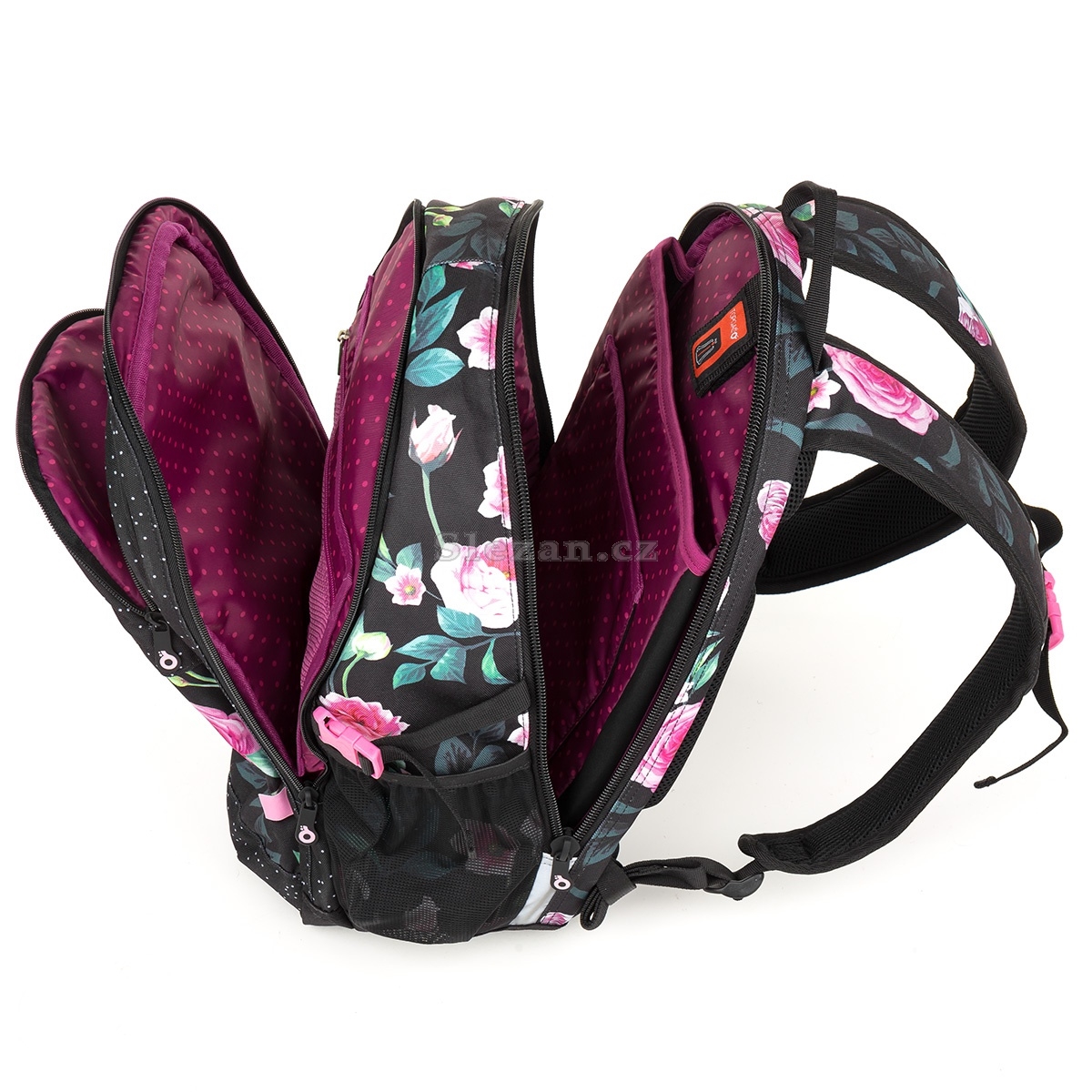 Hitovka pro všechny studentky je na světě! Představujeme zcela nový střih batohu s úžasným potiskem růží doplněných jemnými tečkami. Batoh určitě poslouží nejen na každodenní cesty do školy, vejde se do něj vše nezbytné i na výlety nebo kroužky. Ani na studentských batozích nešetříme polstrováním a výztuhou zad. Ty jsou právě v období dospívání a s ním spojeným růstem zvlášť potřebné. Ergonomicky tvarované a výškově nastavitelné ramenní popruhy jsme navíc doplnili posuvnou hrudní přezkou, která ulehčí váze batohu.