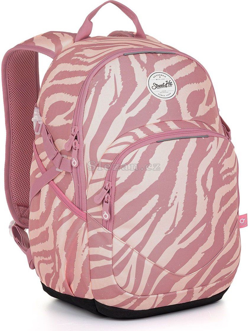Jednokomorový batoh s odlehčeným zádovým systémem z měkké pěny. Součástí velké komory je polstrovaná kapsa na notebook i tablet a síťovaná kapsa na doklady. Tento model je díky své váze vhodný nejen do školy, ale i do města nebo na výlety. Stylový motiv zebry ve dvou odstínech růžové bude současně i módním doplňkem každého outfitu.