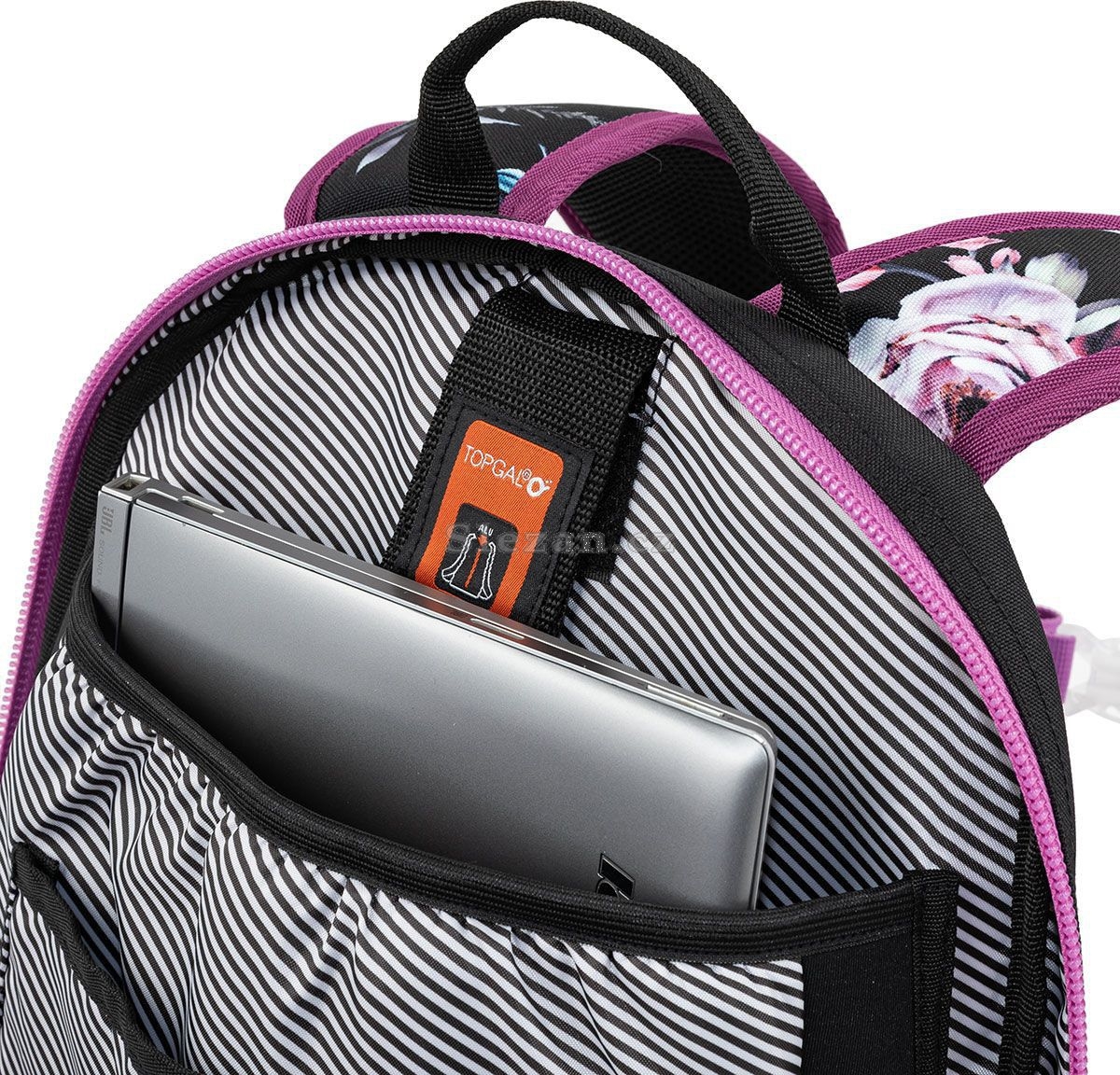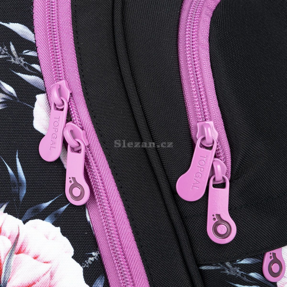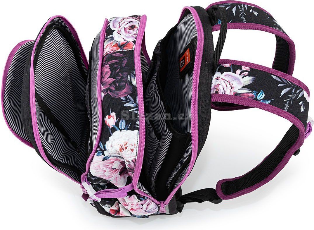 Studentský batoh RUBI má dvě hlavní komory a dvě přední kapsičky. Zadní komora je větší, uvnitř je polstrovaná kapsa na notebook a menší polstrovaná kapsička na powerbanku a další drobnosti. V přední úzké komoře je malá síťová kapsa na zip a karabina na klíče, která je našitá na dlouhé pružence. Hluboká přední kapsa je dost objemná, na ní je našitá ještě jedna menší na drobnosti, které potřebujete mít po ruce.