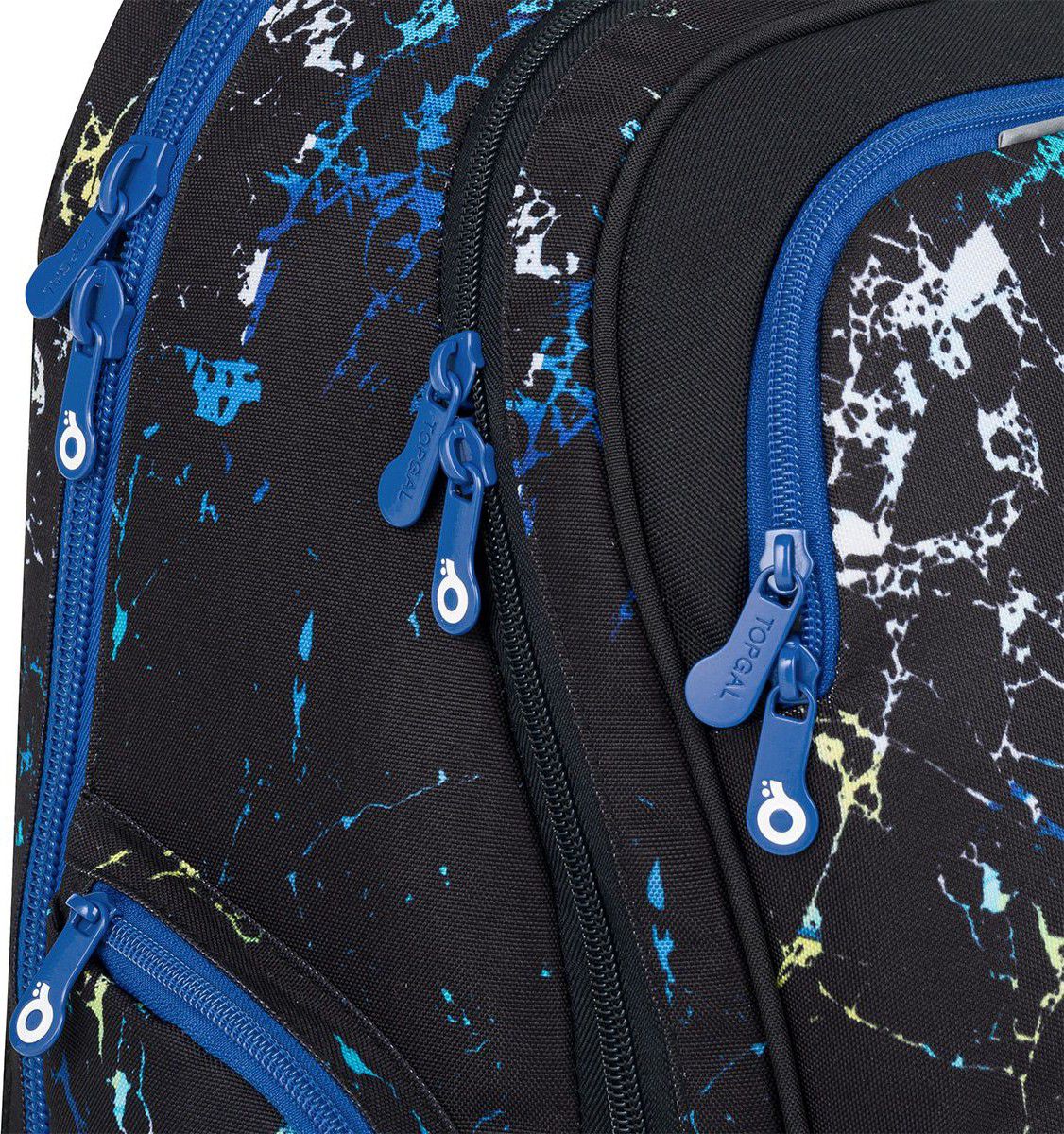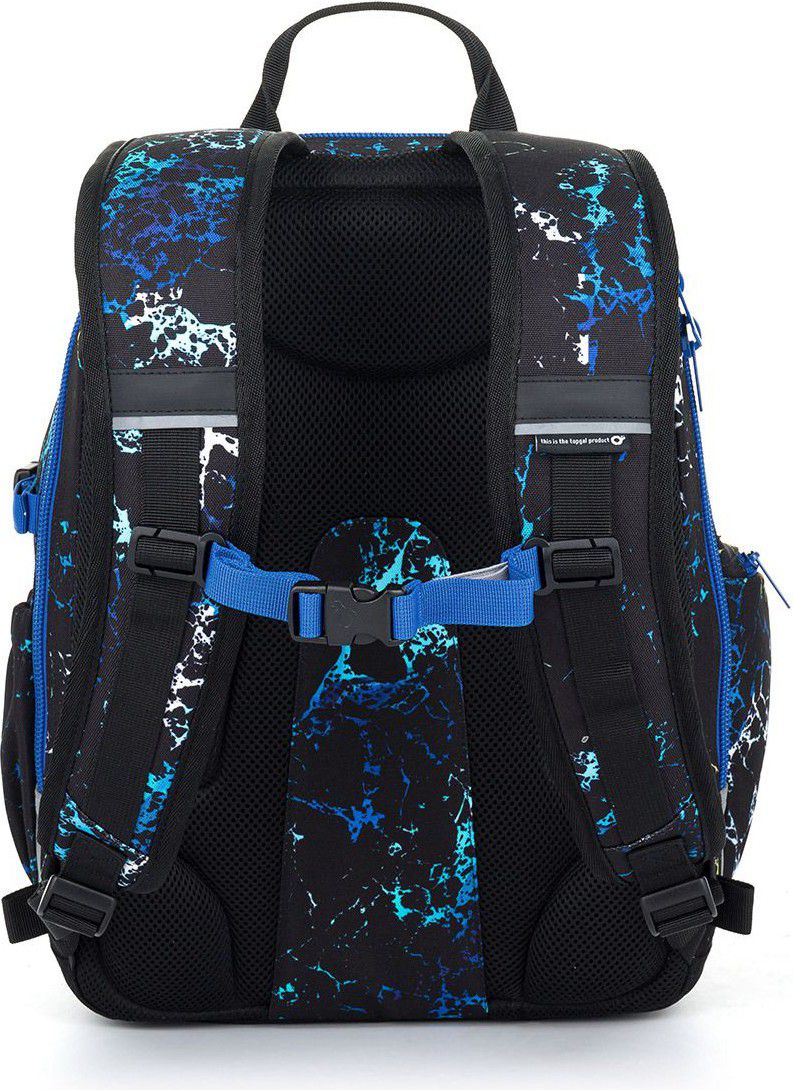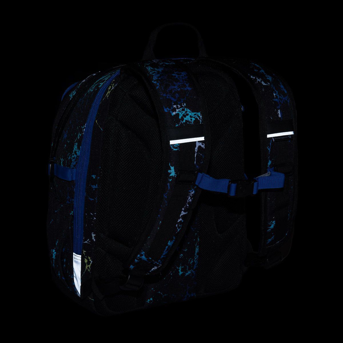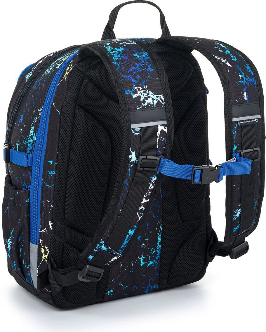 Na přední straně batohu jsou dvě menší kapsy. Do horní kapsy se vejde ETUE 25040 ve stejném designu nebo svačinový box. Postranní kapsy jsou vyrobeny ze stejného materiálu jako batoh – levá je uzavíratelná zipem, pravá skvěle udrží 1,5 litrovou lahev. Reflexní prvky jsou decentní, přesto zaručí skvělou viditelnost.