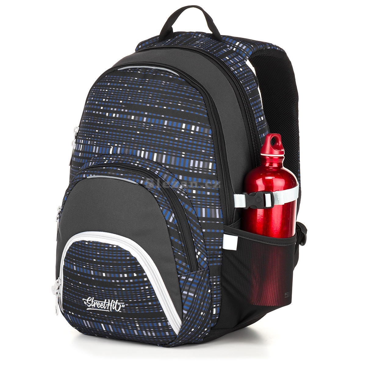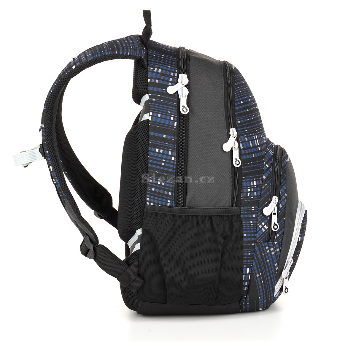 Zadní komora batohu je užší než ta přední. Kromě notebooku do ní uložte ty nejtěžší učebnice. Díky tomu bude batoh na zádech lépe sedět. Přední komora je opravdu velká a objemná, vejde se do ní snad všechno učivo, nebo třeba i penál ETUE 18030. Najdete v ní ještě malou síťovou kapsu na zip. Další drobnosti se vejdou do dvou menších předních kapes, lahvičku s pitím pak dejte do jedné z bočních síťových kapes. Do jedné z nich se vejde i větší PET lahev. Ta se dá upevnit k batohu kompresním popruhem.