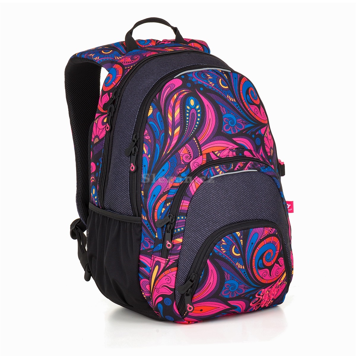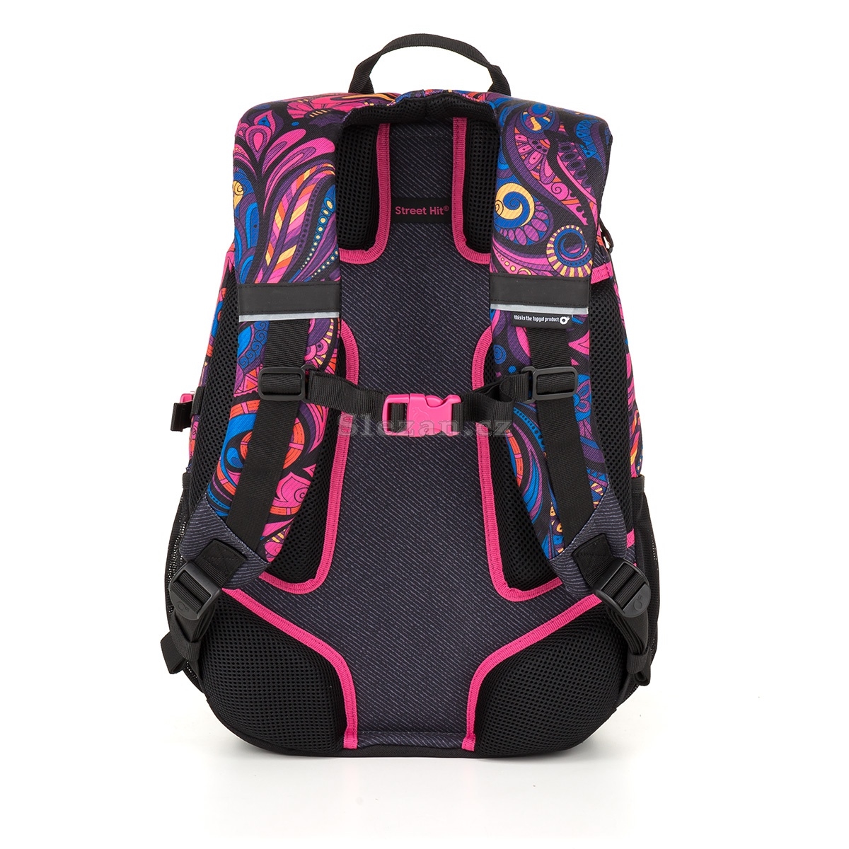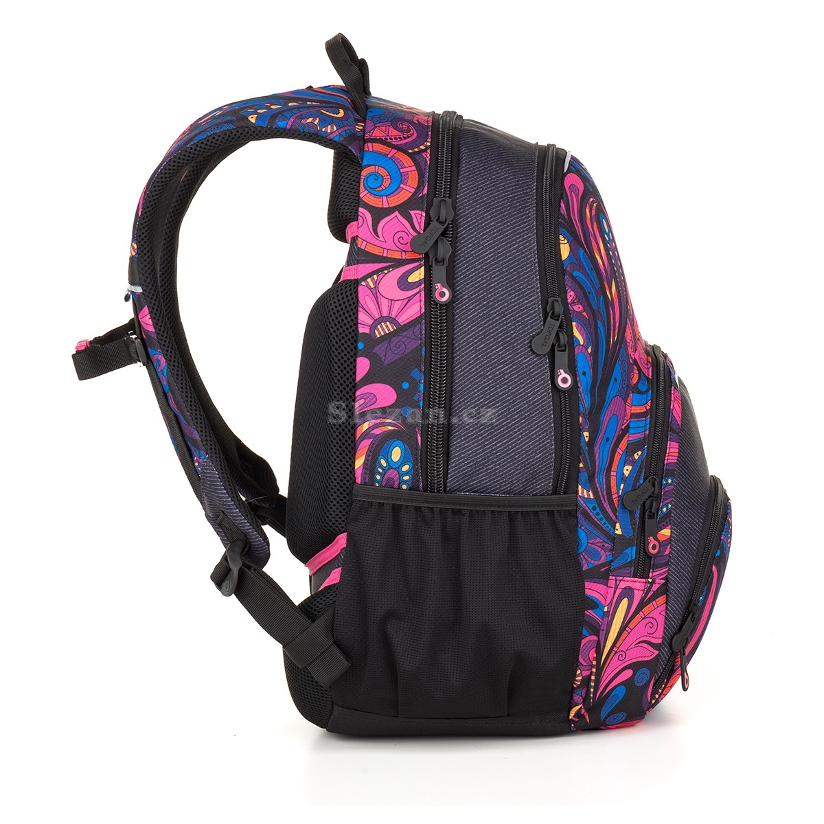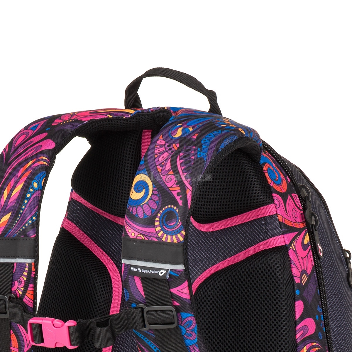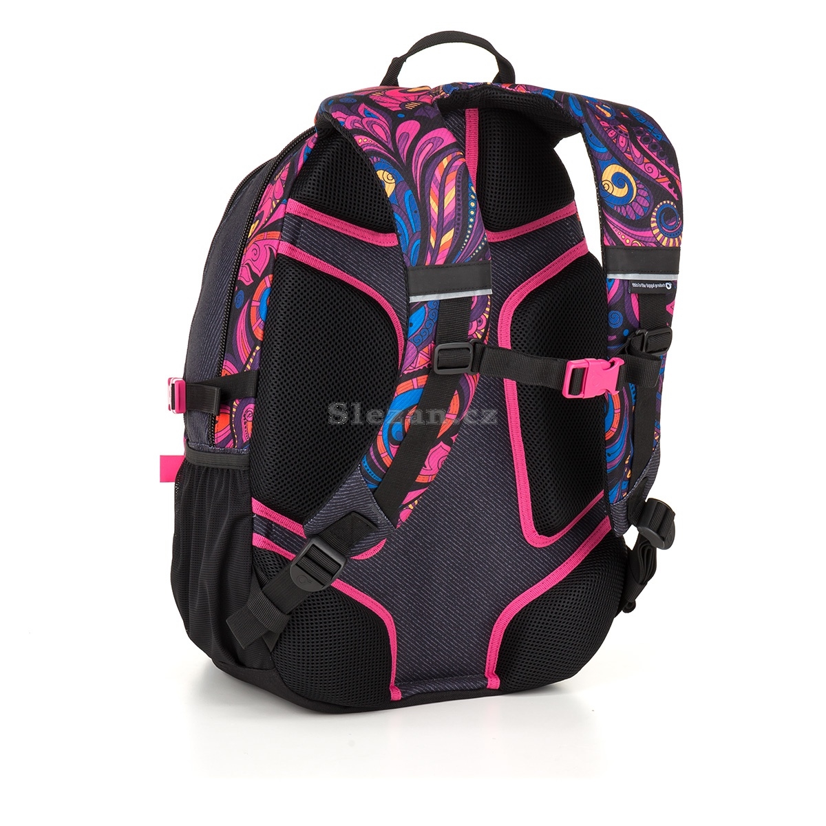 Oblíbený objemný dvoukomorový střih batohu SIAN jsme letos oblékli do zářivějších barev a květinového motivu. Samozřejmostí jsou polstrovaná, anatomicky tvarovaná záda s vyjímatelnou hliníkovou výztuhou. Tu však doporučujeme nevytahovat. Drží totiž pevný tvar zad batohu ve správném anatomickém prohnutí a navíc je lehoučká (0,06 kg), takže její hmotnost na zádech neucítíte.