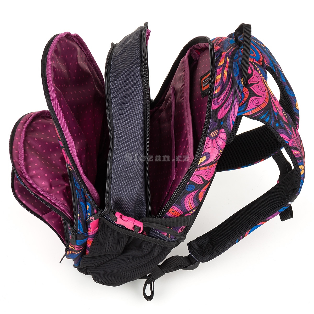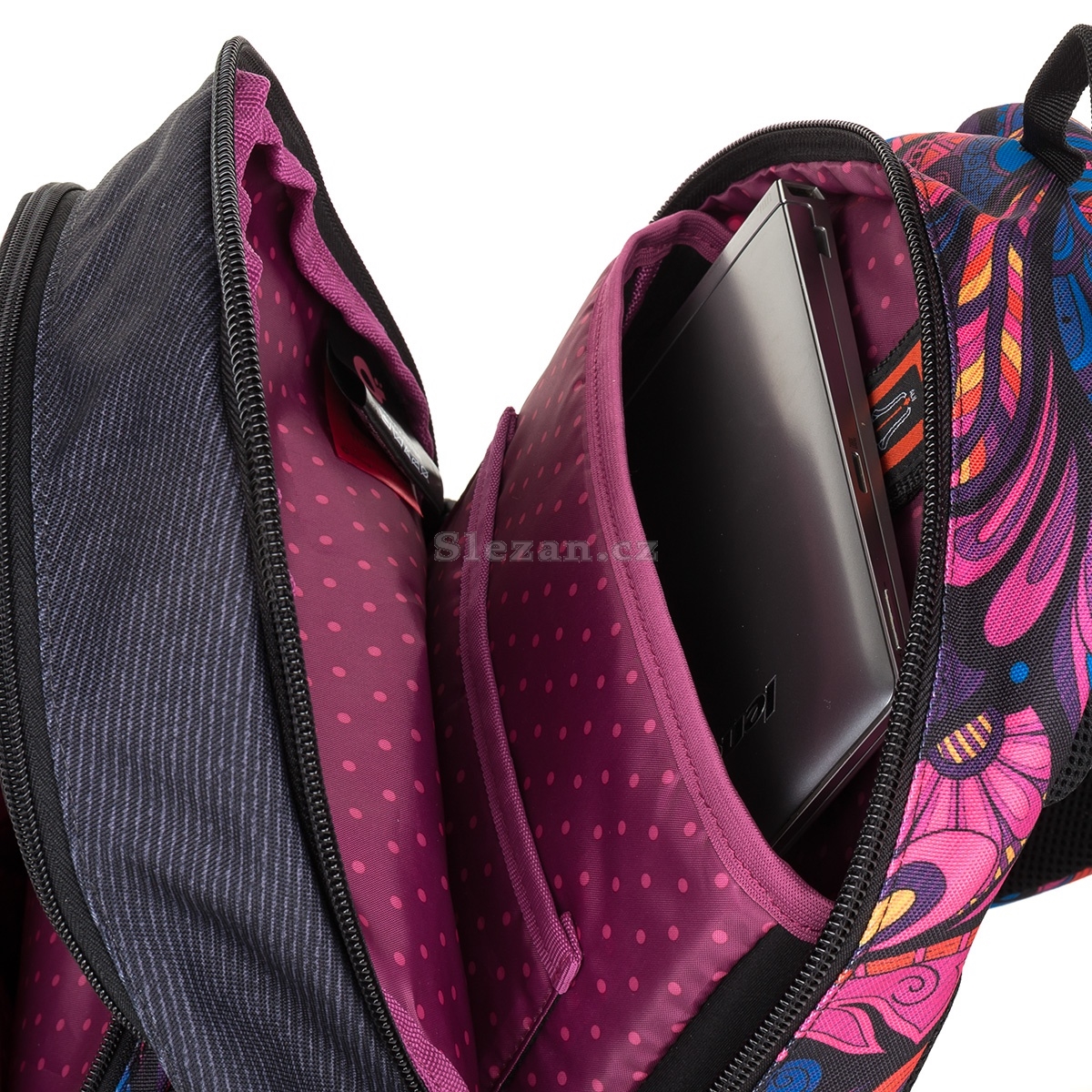 Jak to vypadá uvnitř batohu? Užší zadní komora je perfektní pro umístění pevných desek, sešitů a těch nejtěžších učebnic. Studentky ocení i polstrovanou kapsu na notebook, vhodnou pro vašeho elektronického miláčka do maximální velikosti 15,4”. Kdo nepotřebuje nosit notebook do školy, ten kapsu ocení třeba právě na sešity nebo složky. Na polstrované kapse je pak našita ještě menší, taktéž polstrovaná kapsa třeba na tablet, mobil nebo powerbanku. Přední komora je hodně široká, do té se vejde takřka vše, třeba i věci na kroužky. Navíc ukrývá ještě síťovou kapsu na zip pro všechny drobnosti, co potřebují mít holky po ruce.