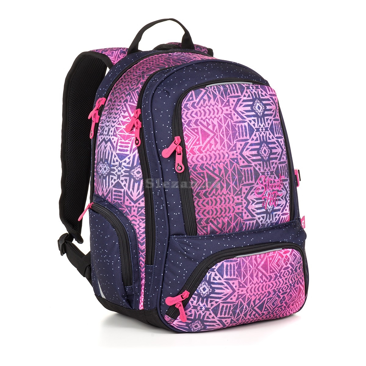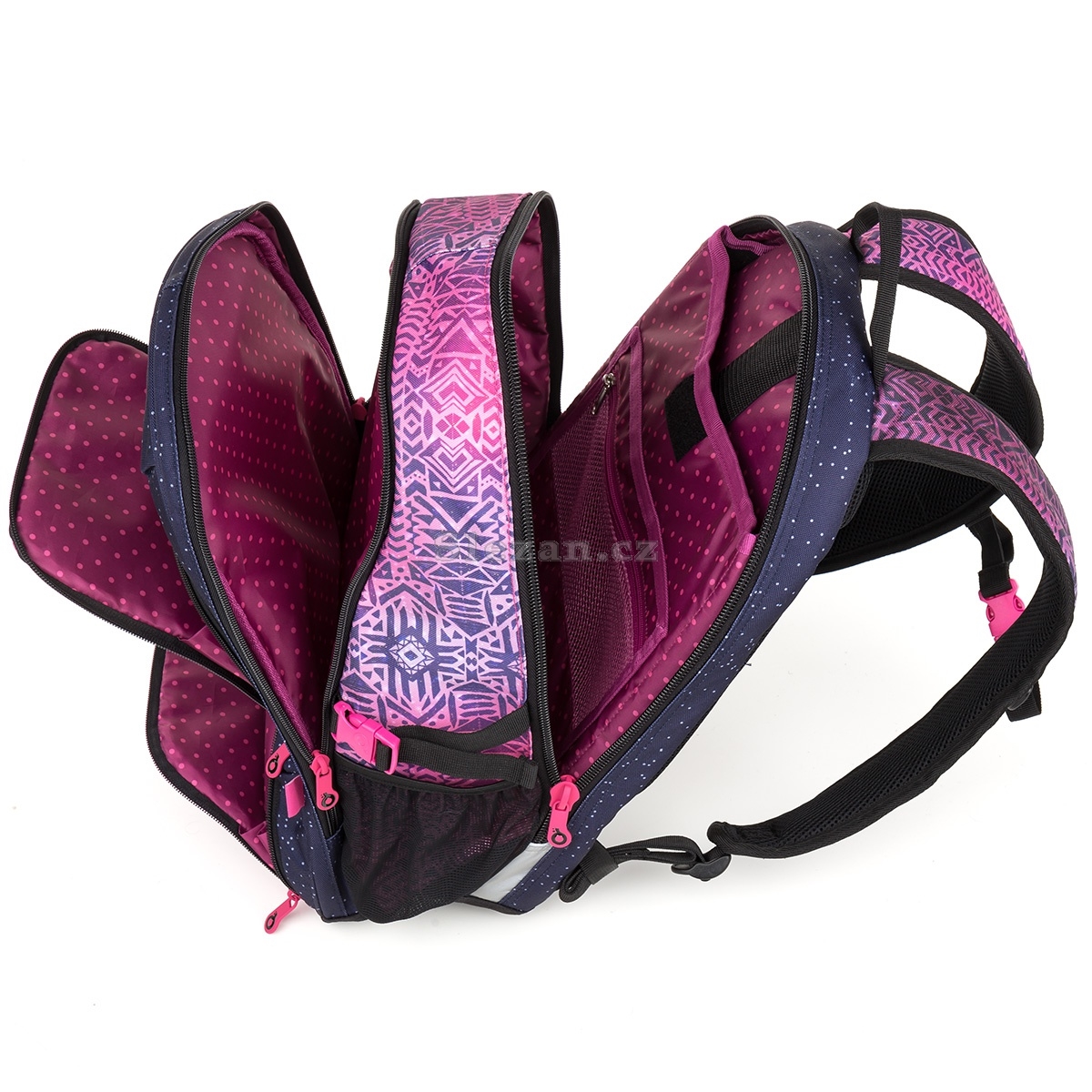 Dvoukomorový studentský batoh střihu SURI se vrací po roční pauze se zbrusu novým vzorem! Kromě skvělého designu s sebou přináší také objemný střih se dvěma předními kapsičkami ve zcela novém lehce etno potisku. Hodí se pro slečny na druhém stupni ZŠ, ale i pro starší studentky, středoškolačky.