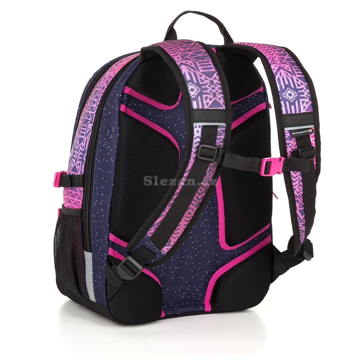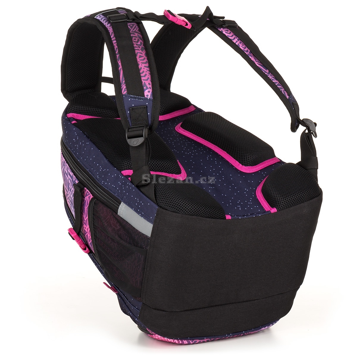 Přední komora je užší, nabízí další prostor pro uložení ostatních školních potřeb. Na boku batohu na nového majitele čeká zipová kapsa na drobnosti, na druhém boku pak síťová kapsa, do které se vejde i větší PET lahev. Díky kompresnímu popruhu s přezkou ji k batohu jednoduše upevníte, takže nevypadne ani při dobíhání autobusu.