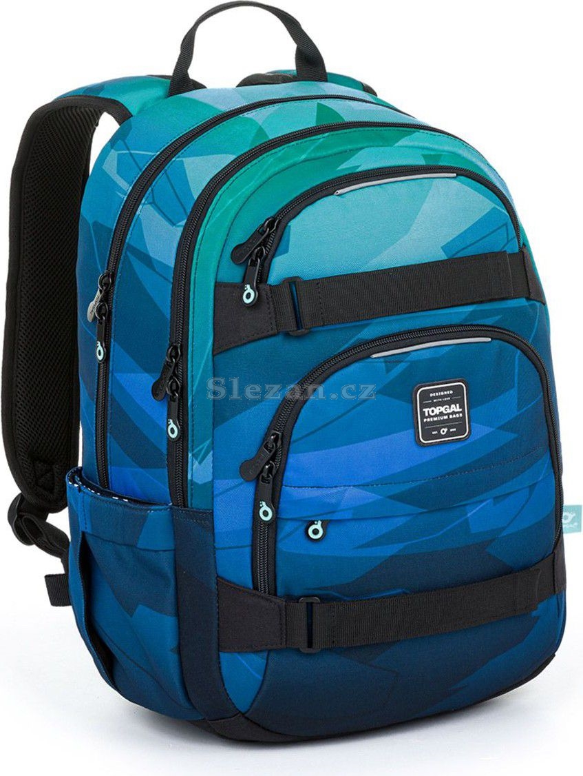 Objemný dvoukomorový batoh v zelenomodré kombinaci. Záda batohu jsou polstrovaná a anatomicky tvarovaná. Uvnitř zadní komory najdete polstrovanou kapsu na notebook i tablet, v druhé komoře kapsičku na zip a karabinu na klíče.