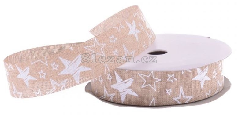 Vánoční stuha imitace juty s potiskem bílých hvězd.