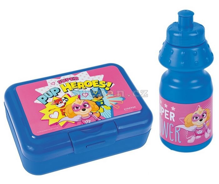 - Sada obsahuje nápojovou láhev o objemu 350 ml s výlevkou, která se snadno otevírá a zavírá tlačítkem, což usnadňuje pití nápoje. Láhev je pokryta grafikou ze série Paw Patrol.