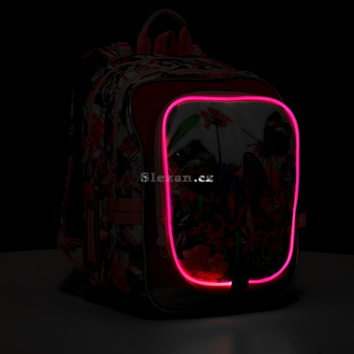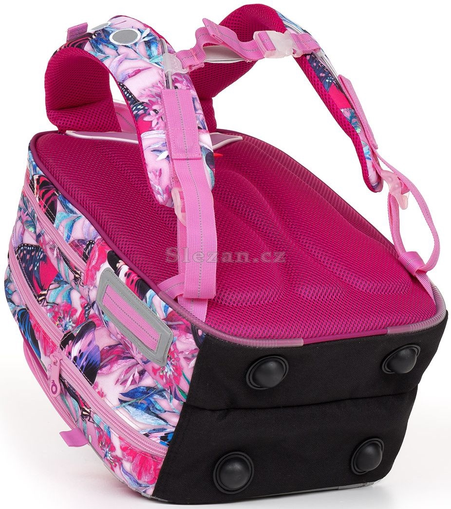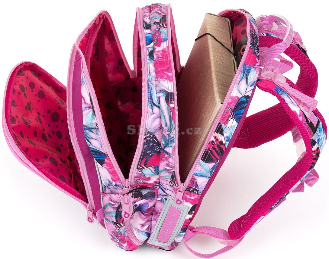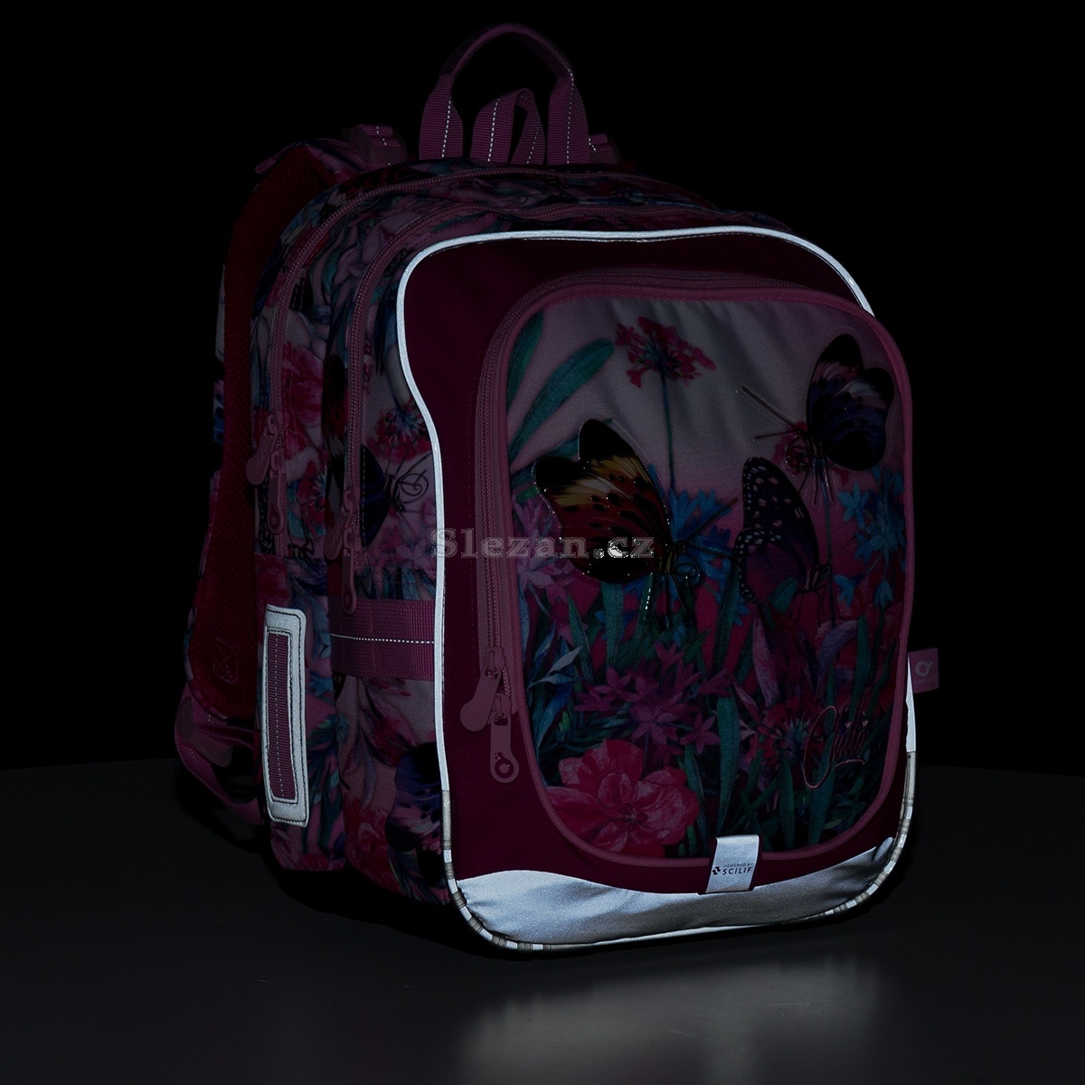 Přední kapsa s motýly ukrývá kromě kapsičky se světelným vláknem i praktickou karabinku na klíče. Můžete sem umístit penál a další drobnosti. Láhev na pití pak dáte do kapsy na boku batohu. Bezpečnost i při špatné viditelnosti zajistí plno reflexních prvků. Zipy jsou opatřené kvalitními kovovými taháčky s protiskluzovou úpravou.