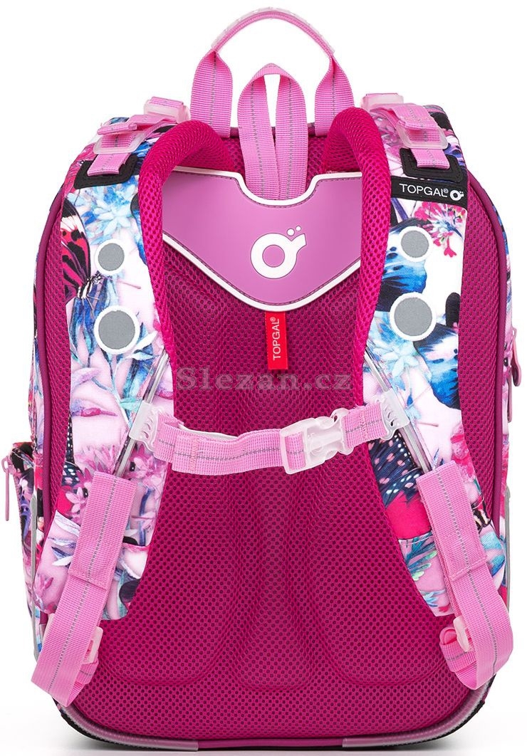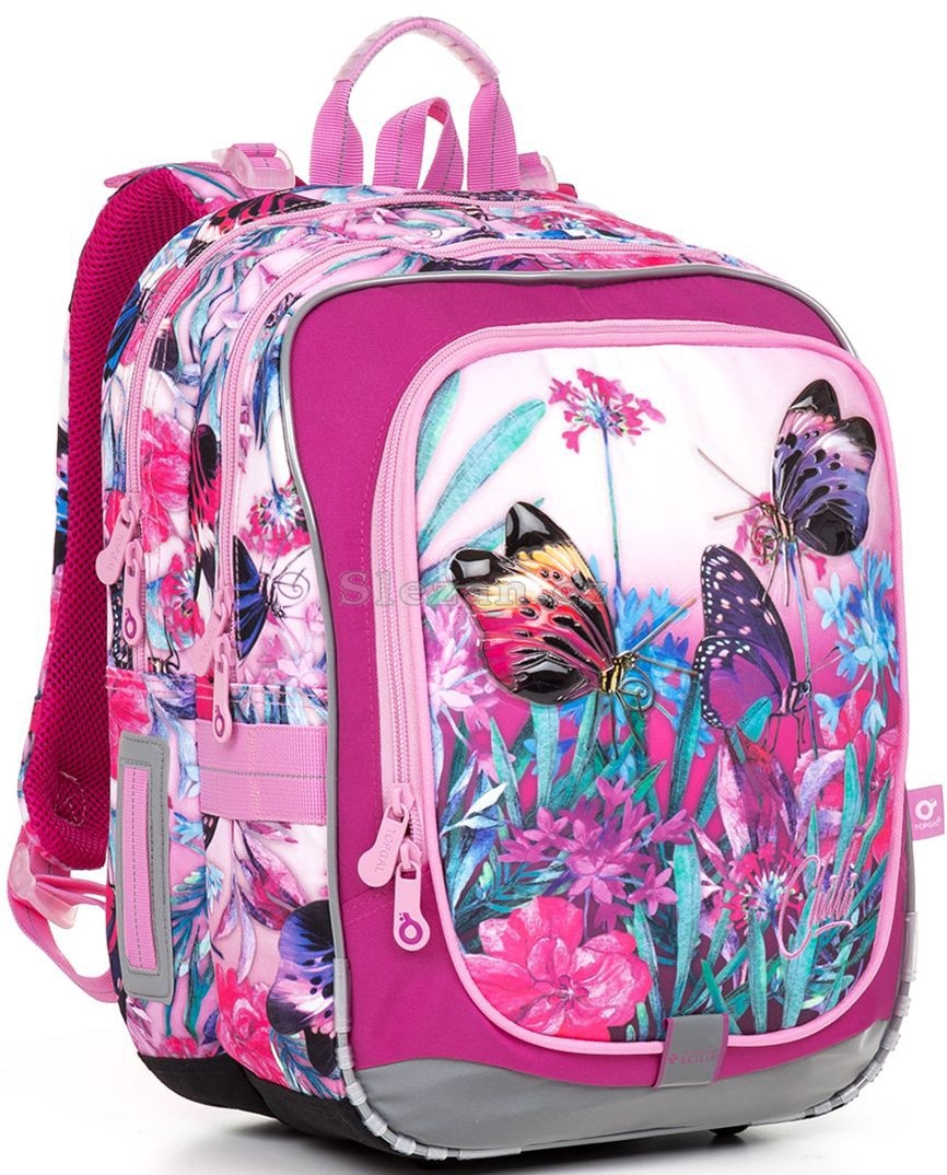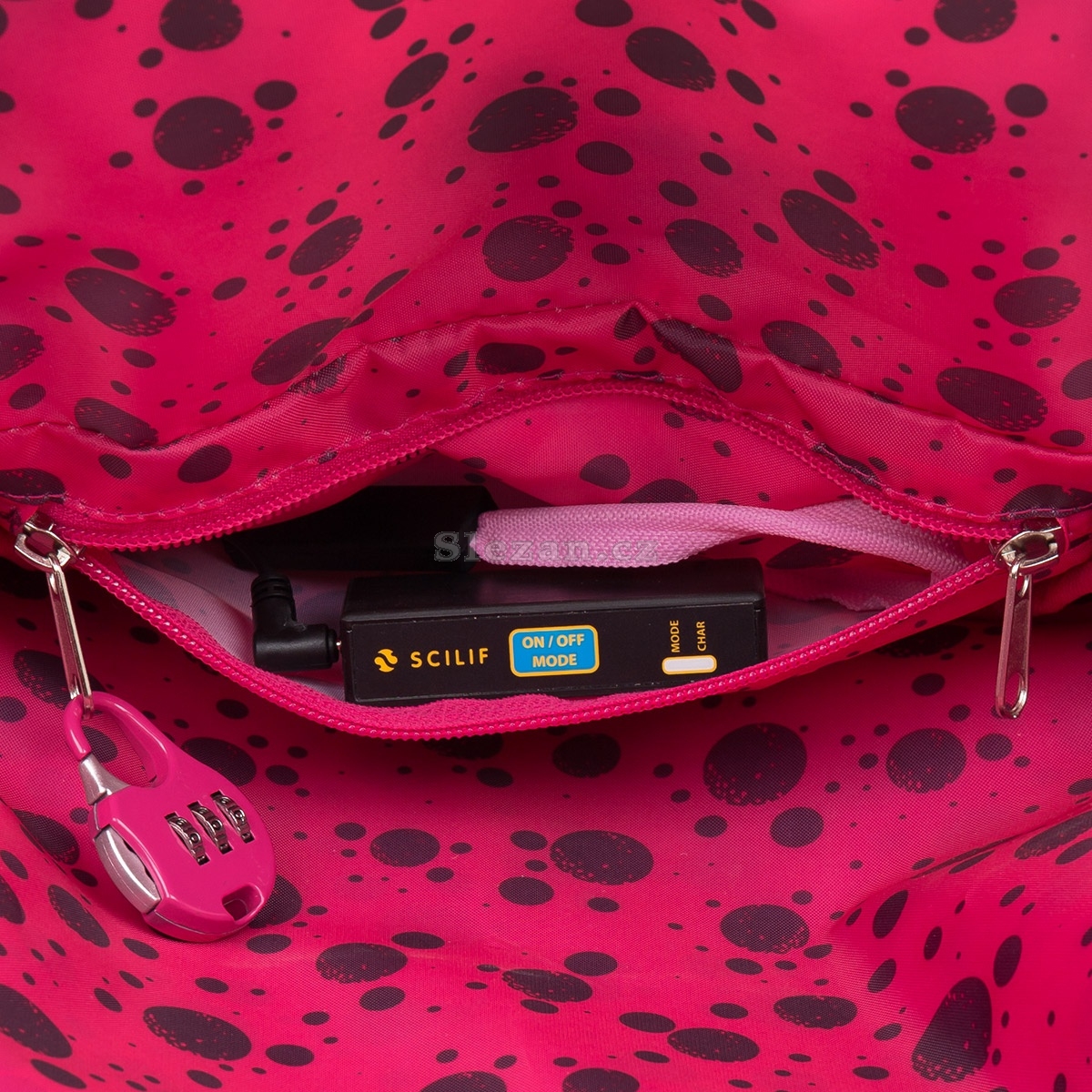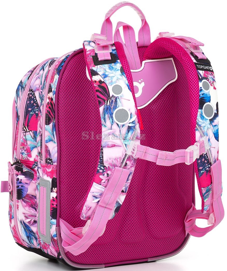 Přední kapsa s motýly ukrývá kromě kapsičky se světelným vláknem i praktickou karabinku na klíče. Můžete sem umístit penál a další drobnosti. Láhev na pití pak dáte do kapsy na boku batohu. Bezpečnost i při špatné viditelnosti zajistí plno reflexních prvků. Zipy jsou opatřené kvalitními kovovými taháčky s protiskluzovou úpravou.