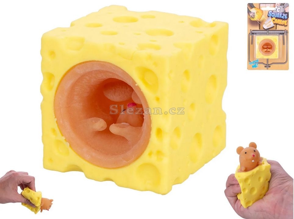 Zábavná hračka ve tvaru sýra, ze kterého vyskakuje malá myška.