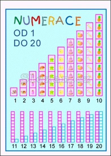 Graficky přehledná numerace v oboru 1 - 10 s obrázky a 11 - 20 s čtverečky.