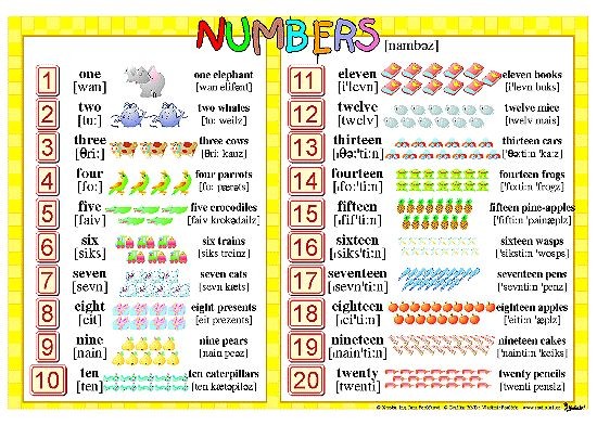 Přehled číslovek s přepisem anglické výslovnosti, krátkou frází a obrázky k zapamatování.