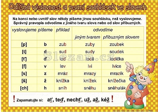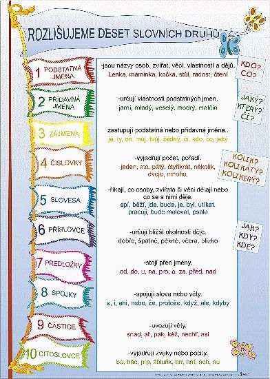 Karty jsou na tvrdém papíru oboustranně potištěné a opatřené lakovou úpravou odolnou proti ušpinění a oděru. formát A4, křídový karton lakovaný Rozlišujeme 10 slovních druhů Přehled slovních druhů v obrázku, včetně příkladů. Odlišná výslovnost a psaní souhlásek Tabulka přehledně vyvozující spodobu.