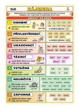Přehledně zpracované a bohatě ilustrované téma zájmena vhodné i pro dyslektiky. - druhy zájmen (přední strana) - osobní, přivlastňovací, ukazovací, tázací, vztažná, neurčitá