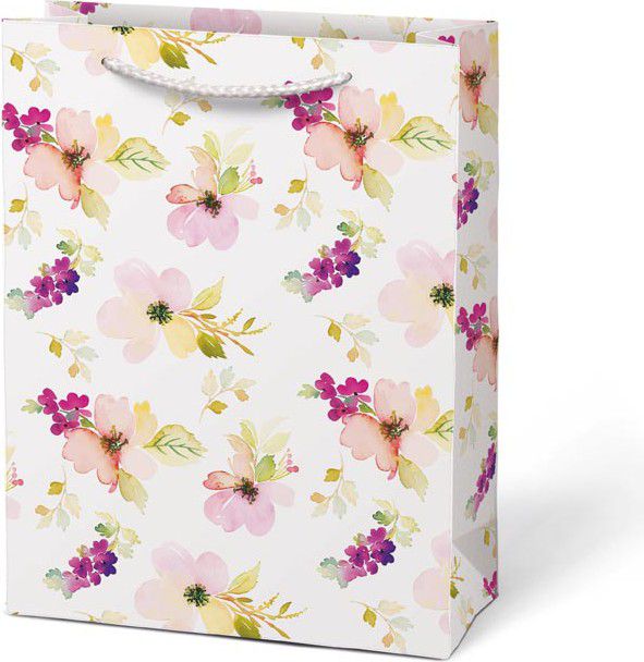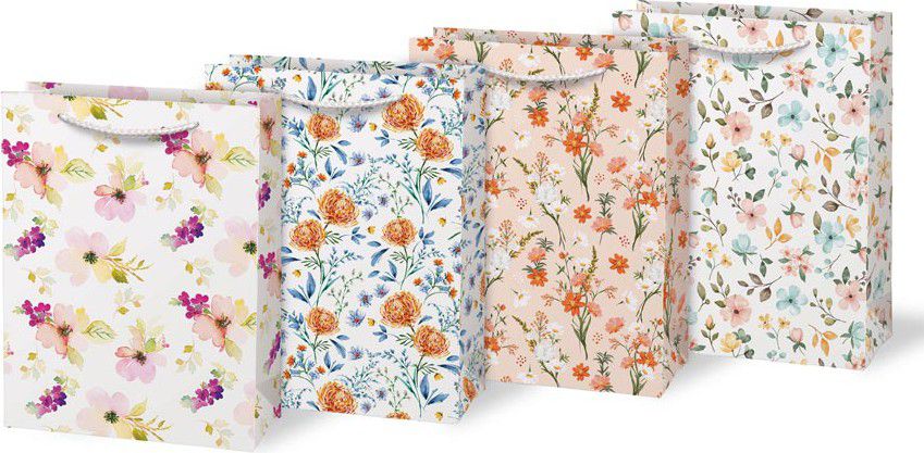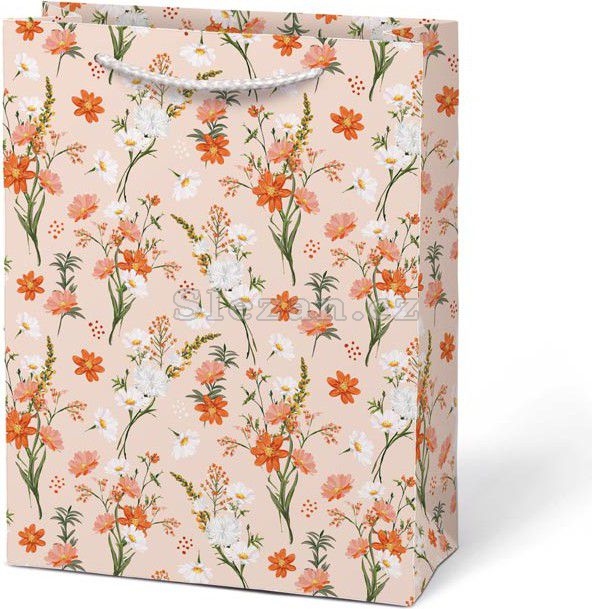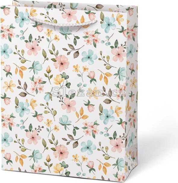 Dárková papírová taška T4 zdobená různými květinovými motivy.