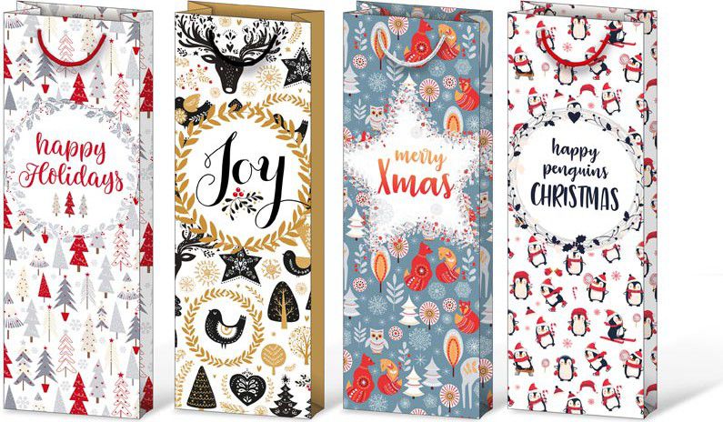 Papírová dárková taška s vánočními motivy a nápisy happy Holidays, Joy, merry Xmas, happy penguins Christmas - vhodné na láhev vína