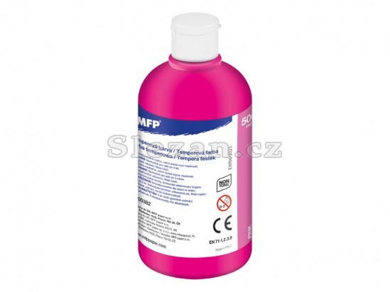 Temperové barvy MFP 500 ml - růžová (magenta). Temperové barvy jsou připravené k okamžitému malování, snadno se používají a míchají. Jsou v pračce vypratelné z většiny textilií, je dobré před praním skvrny předčistit ručně mýdlem. Vysoká hodnota pigmentu v barvě zaručuje maximální krycí vlastnosti a kvalitu. Barvy jsou výborně odolné proti vyblednutí. Díky většímu balení jsou tyto barvy vhodné pro školy, školky a různé umělecké kroužky.