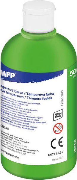 Temperové barvy MFP 500 ml - světle zelená. Temperové barvy jsou připravené k okamžitému malování, snadno se používají a míchají. Jsou v pračce vypratelné z většiny textilií, je dobré před praním skvrny předčistit ručně mýdlem. Vysoká hodnota pigmentu v barvě zaručuje maximální krycí vlastnosti a kvalitu. Barvy jsou výborně odolné proti vyblednutí. Díky většímu balení jsou tyto barvy vhodné pro školy, školky a různé umělecké kroužky. Barva: světle zelená Obsah barvy v jedné láhvi: 500 ml Varování: Nevhodné pro děti do 3 let. Nebezpečí spolknutí malých částí. EN71 - 1,2,3,9