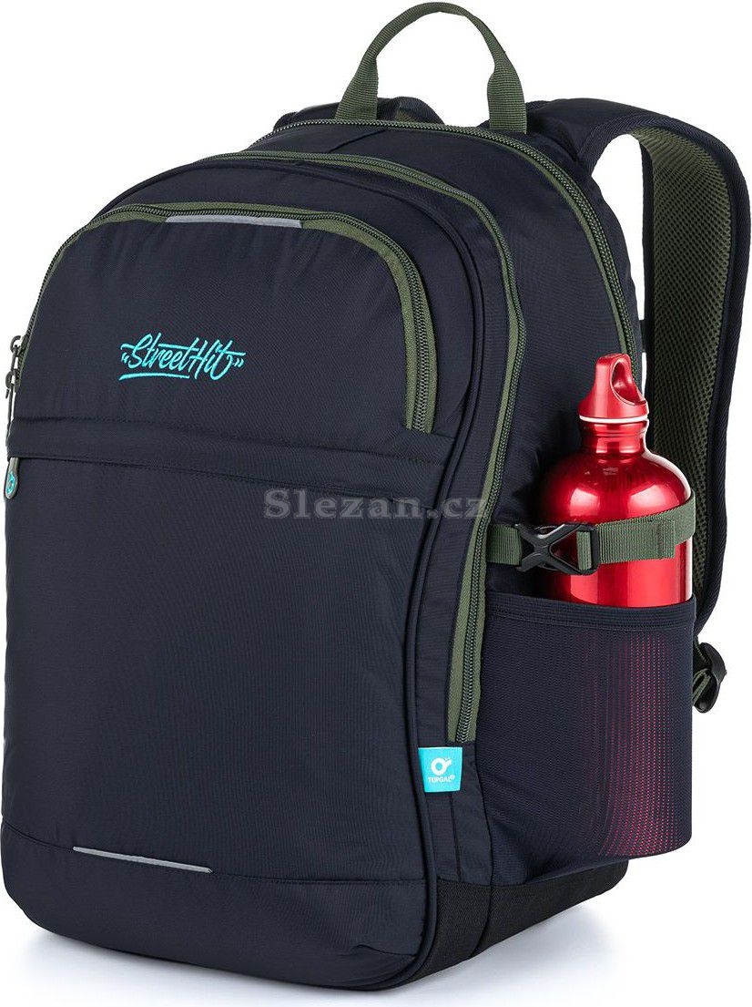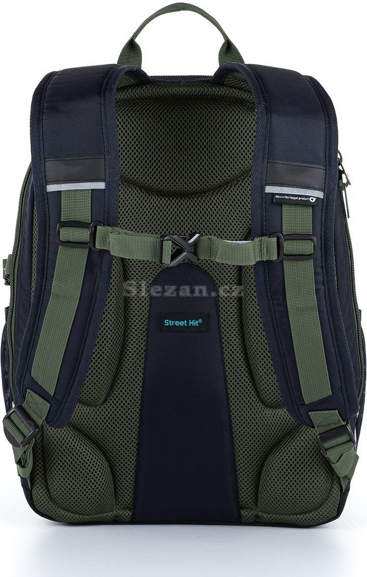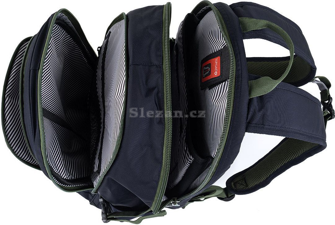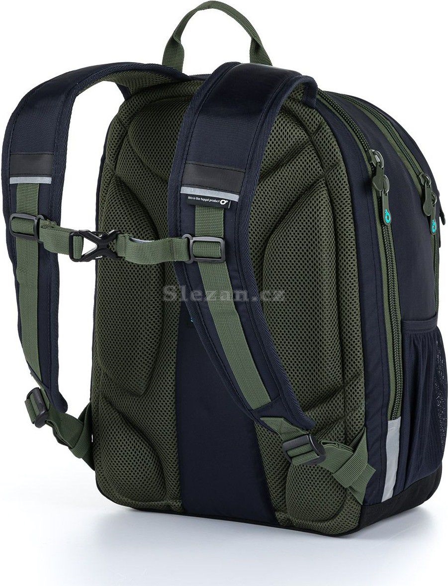Ty jsou výškově nastavitelné, stejně tak jako hrudní popruh. Zadní komora batohu je velmi objemná, dáte do ní nejvíce nákladu jak školního, tak i třeba potřeby na kroužky. Uvnitř komory je polstrovaná kapsa na notebook či složky a ještě jedna menší kapsička, třeba na mobil či powerbanku.