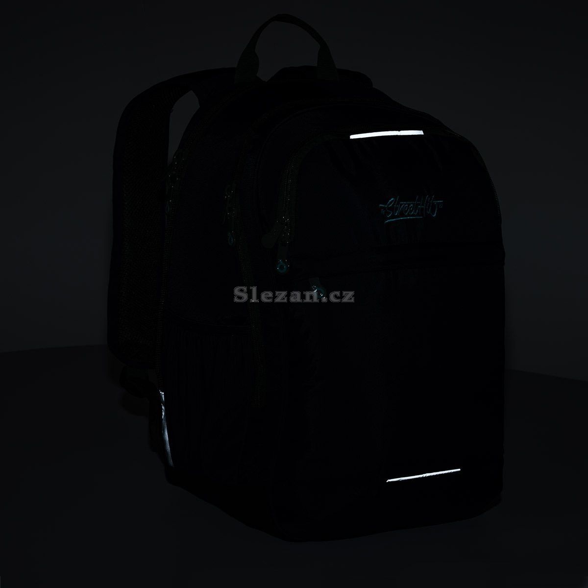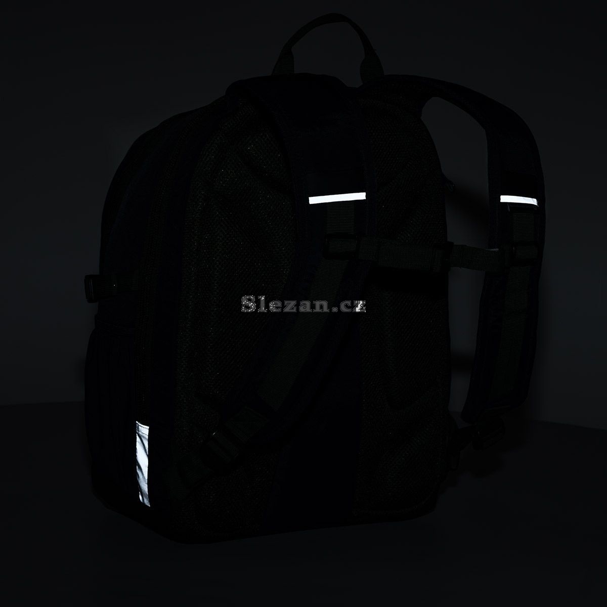 Reflexní prvky jsou zasazené do čela, na bok i na ramenních popruzích batohu.