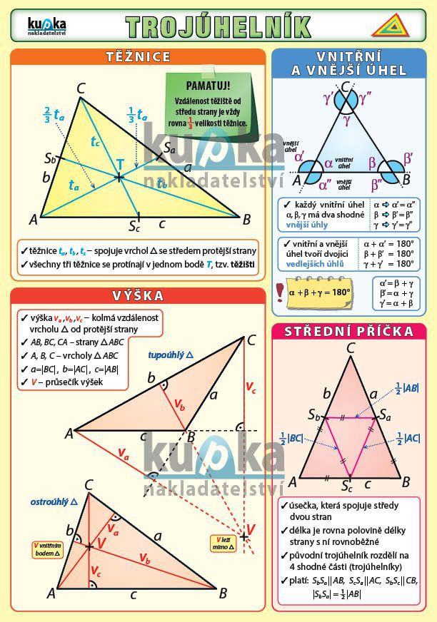 Trojúhelník obsahuje základní pojmy (těžnice, vnitřní a vnější úhel, výška, střední příčka), rozdělení podle velikosti úhlů a podle velikosti stran.
