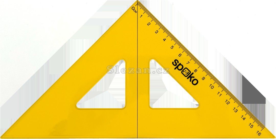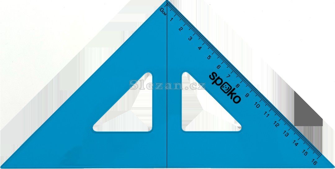 Rovnoramenný pravoúhlý trojúhelník s ryskou a předtištěnou stupnicí o délce 16 cm.