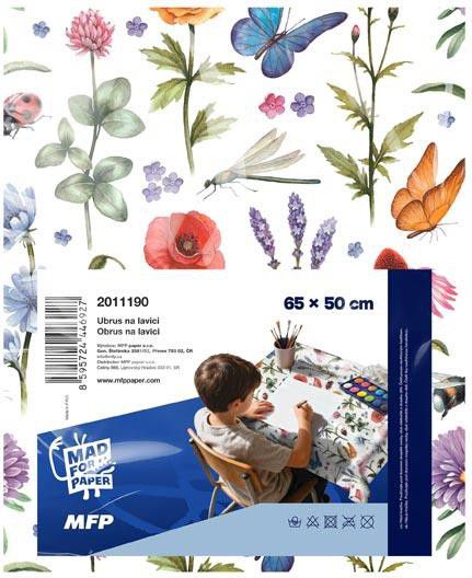 Praktický ubrus na lavici, který chrání povrch při výtvarných a pracovních činnostech. Poskytuje dostatek prostoru pro běžnou práci i tvoření. Využijete ho ve škole, doma při tvoření i při různých rukodělných aktivitách. Ubrus zdobí drobné barevné kvítky, lístky a motýli. Nečistoty lze snadno setřít vlhkým hadříkem a ubrus je tak ihned připraven k dalšímu použití. Rozměr: 65 x 50 cm Motiv: luční kvítí a hmyz Uvedená cena je za 1 ks.