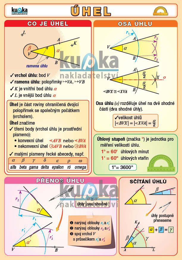 Úhel (pro 2. stupeň ZŠ) obsahuje základní pojmy, konstrukce osy úhlu, přenos úhlu, rozdělení úhlů podle velikosti, dvojice úhlů.