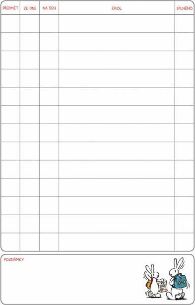 - ÚKOLNÍČEK OBSAHUJE: - osobní údaje - telefonní čísla - prostor pro poznámky - malá násobilka - geometrické vzorce a matematické vzorečky - vyjmenovaná slova - rozvrh hodin