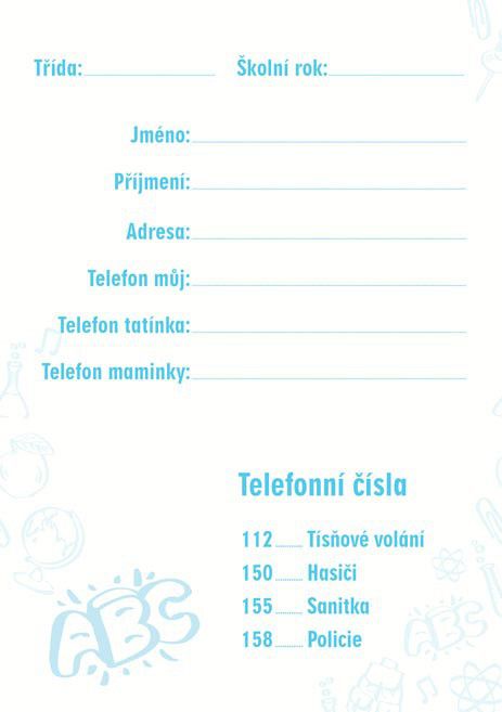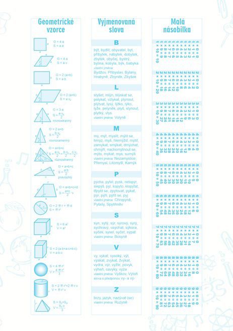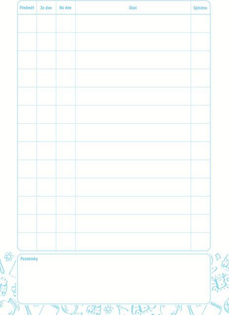 - ÚKOLNÍČEK OBSAHUJE: - osobní údaje - telefonní čísla - prostor pro poznámky - malá násobilka - geometrické vzorce a matematické vzorečky - vyjmenovaná slova - rozvrh hodin
