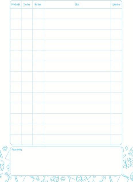 Školní den má někdy tempo jako závodní okruh – a právě proto je dobré mít všechny úkoly a poznámky přehledně na jednom místě. Tento úkolníček MFP s motivem formule je navržený tak, aby se stal spolehlivou součástí každodenní školní výbavy. Formát A6 je kompaktní a praktický. Stránky mají dost prostoru na zápisy a jejich přehledné členění usnadňuje orientaci. ÚKOLNÍČEK OBSAHUJE: - osobní údaje - telefonní čísla - prostor pro poznámky - malou násobilku - geometrické a matematické vzorce - vyjmenovaná slova - rozvrh hodin Formát: A6 Motiv: formule Počet stran: 40 Uvedená cena je za 1 ks.