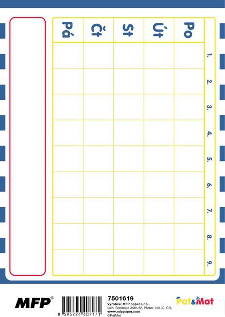 Hledáte ideálního parťáka pro školní povinnosti? Úkolníček s motivem Pata a Mata je přesně to pravé! S kompaktním formátem A6 se snadno schová do batohu, tašky nebo i do kapsy. Pomáhá udržet přehled o úkolech a rozvrhu, a přitom motivuje k zodpovědnosti a organizaci – a to všechno s úsměvem. Neváhejte a pořiďte si úkolníček, se kterým bude školní rok jedna radost!