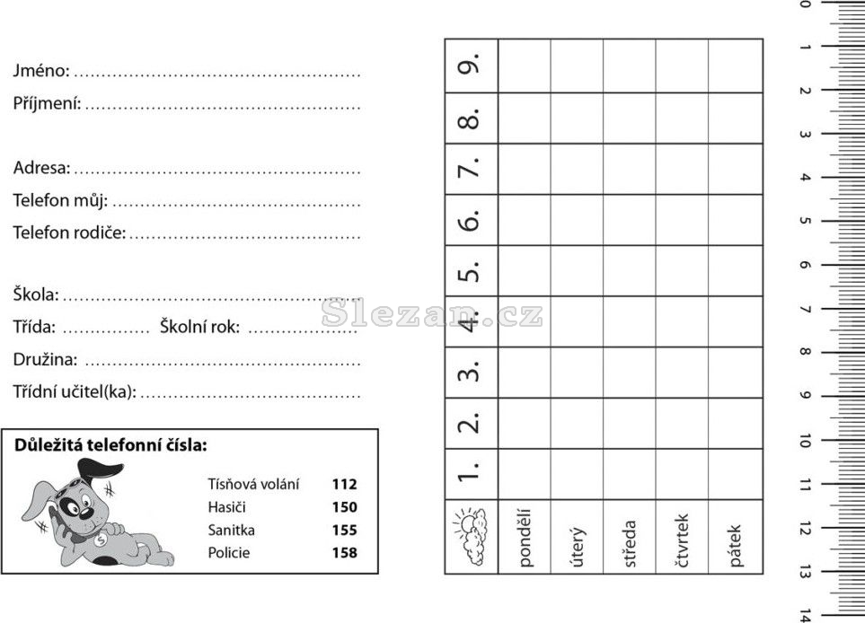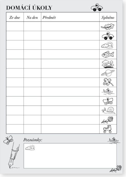 Školní deníček – úkolníček ve formátu A6 s rozvrhem hodin s možností zapisování úkolů a poznámek.