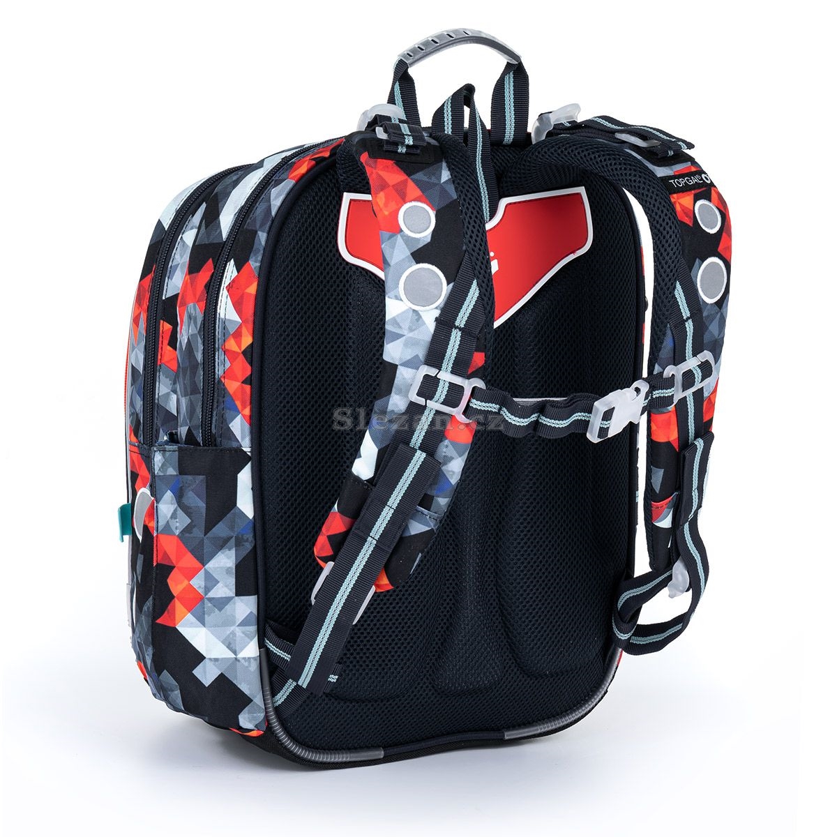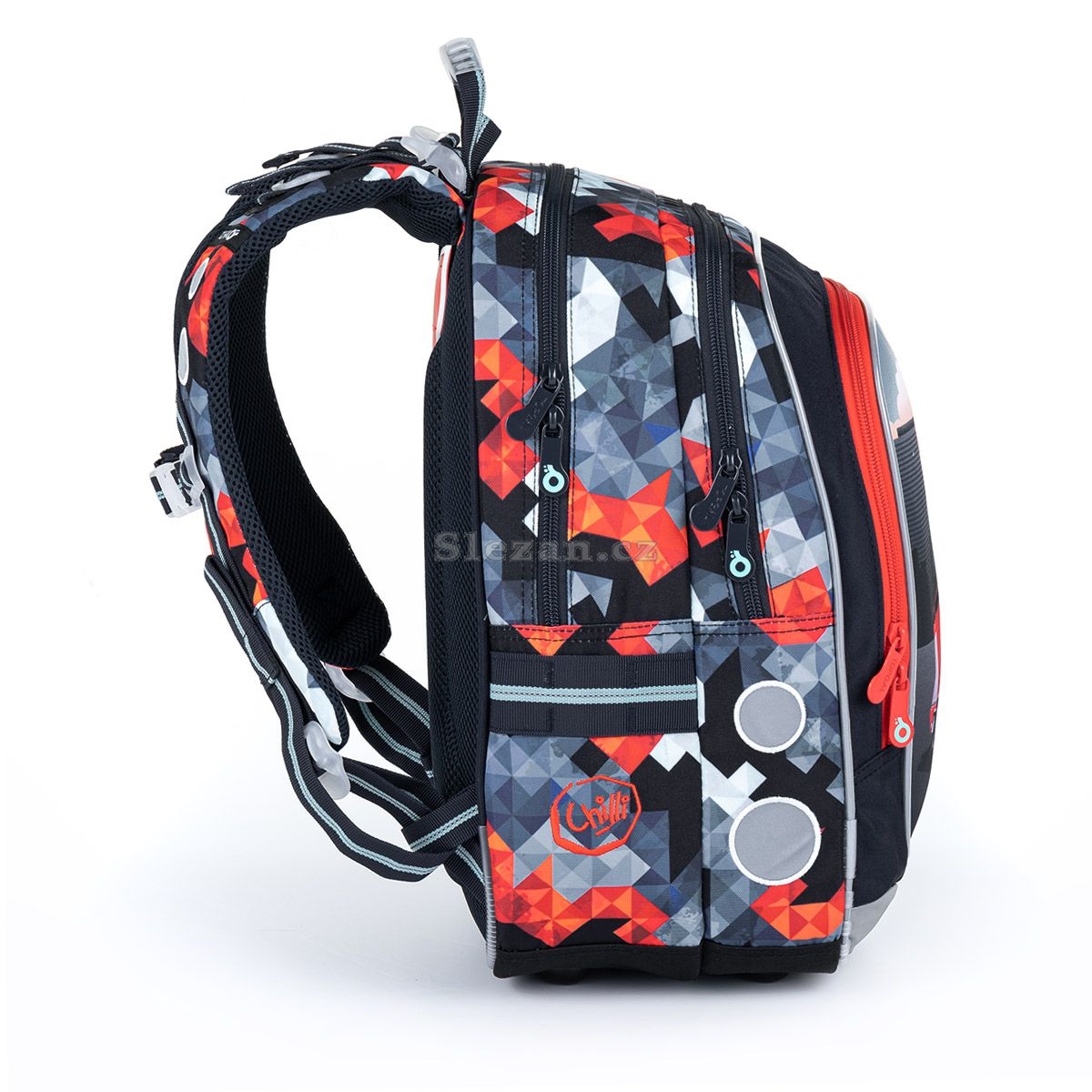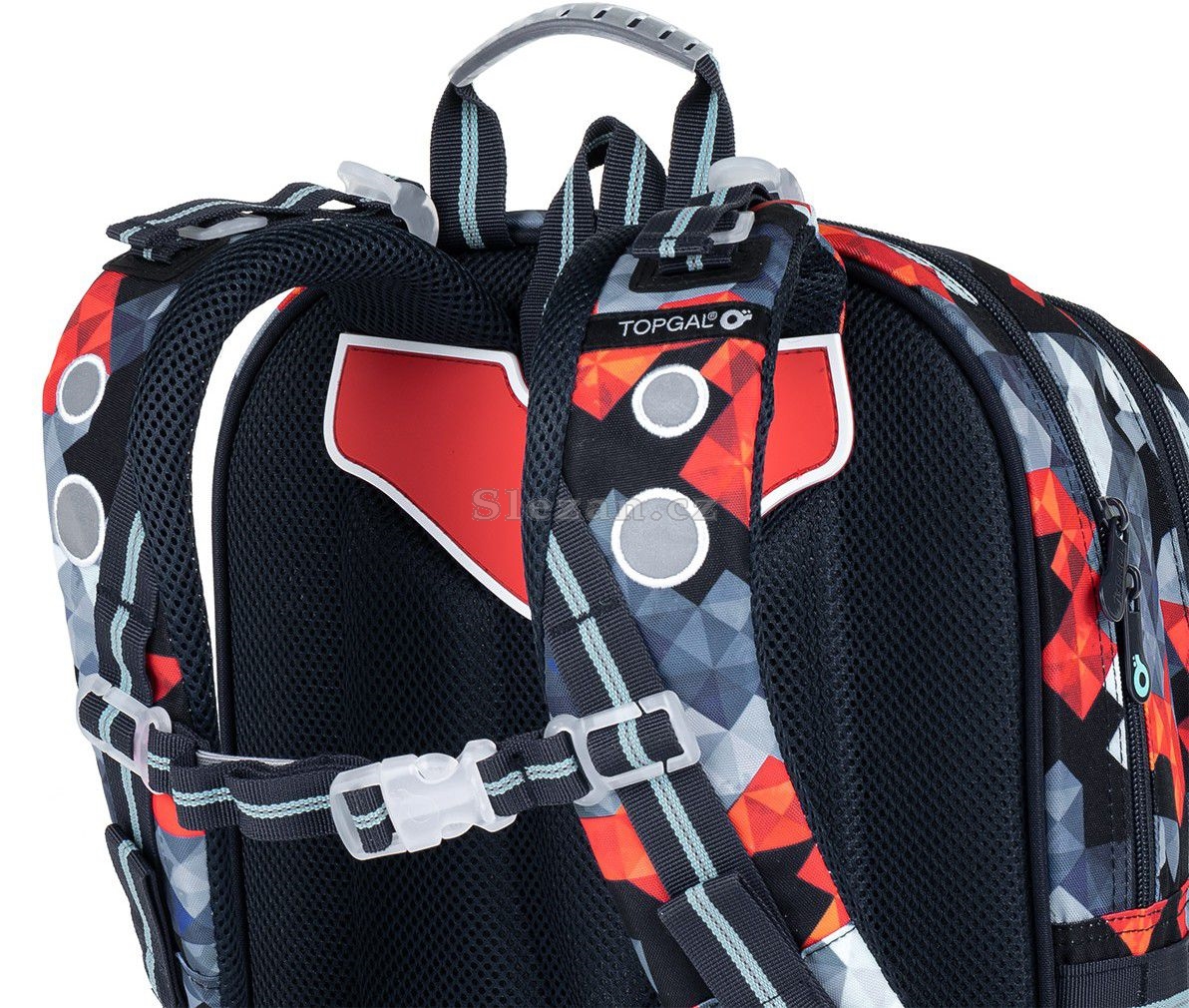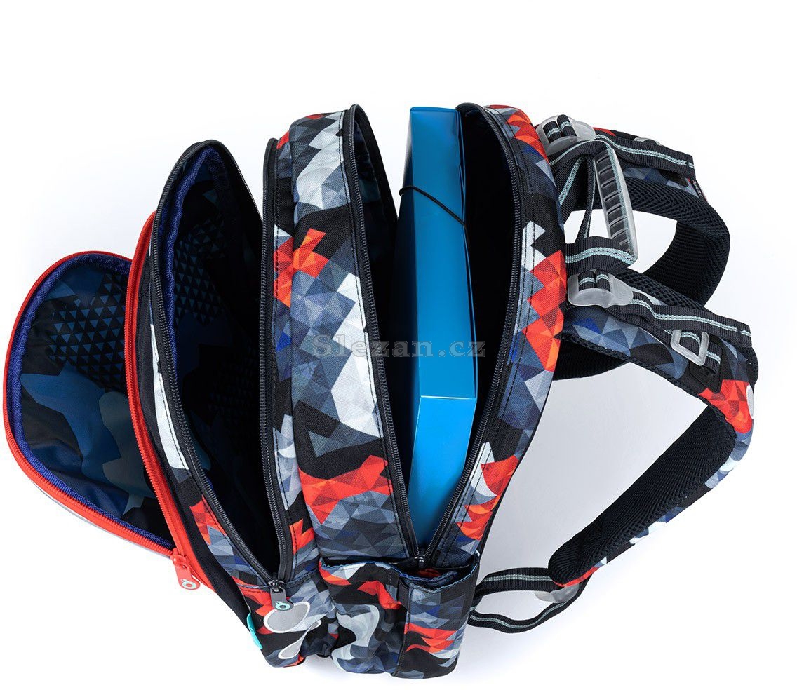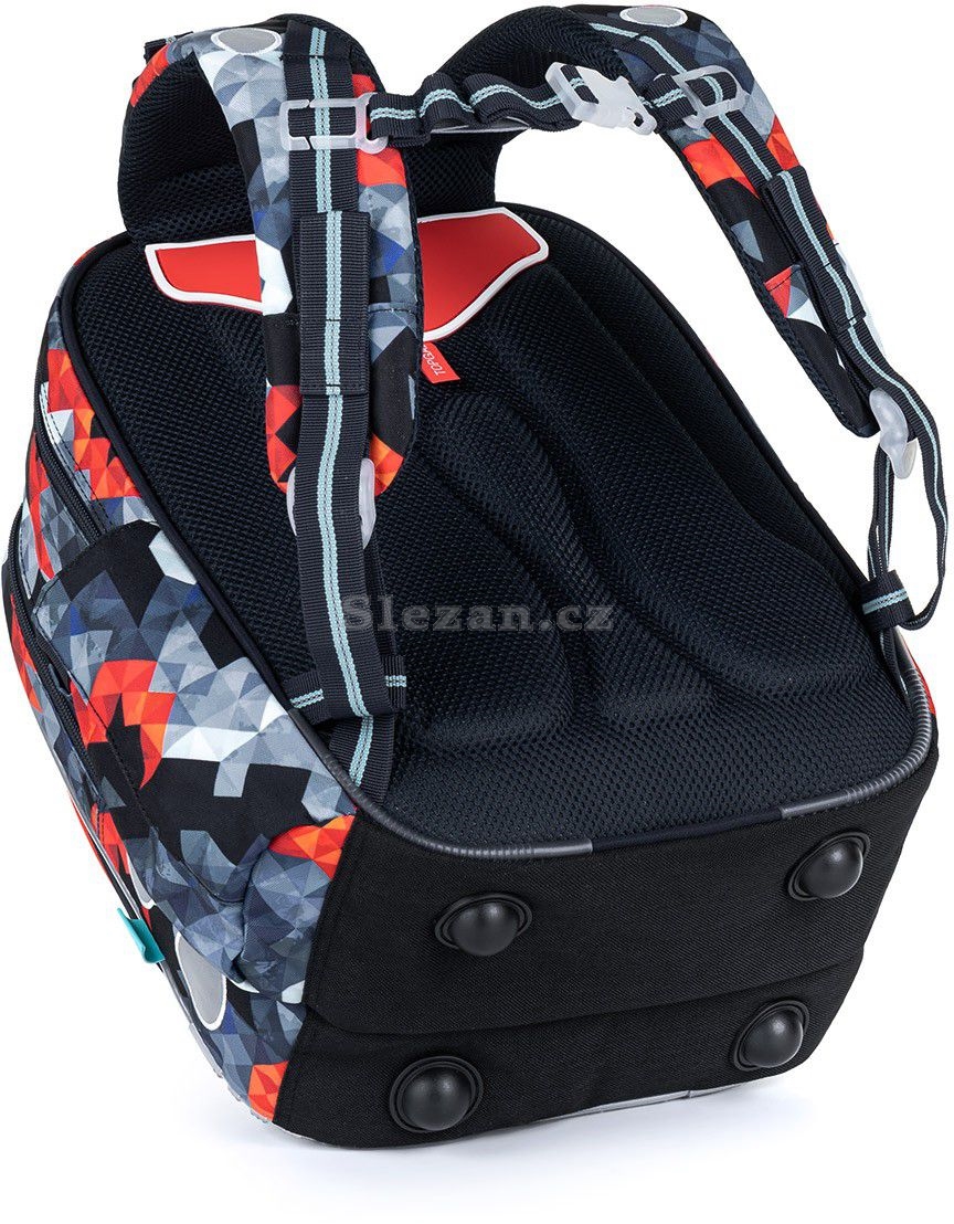 Zádový systém je ultralehký díky anatomicky tvarované lisované pěně. I na zádech malého hasiče bude batůžek sedět jako ulitý. Ramenní popruhy jsou totiž polstrované, anatomicky tvarované a hlavně – dají se utáhnout v horní i spodní části batohu. Výškově nastavitelný hrudní pásek zajistí, že popruhy nebudou sjíždět ani z drobných zad. Nejtěžší školní potřeby dávejte vždy co nejblíže zádům do zadní komory. Ta je širší než přední komora a pojme vše potřebné do prvních tříd ZŠ.