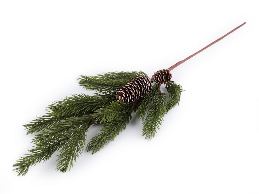 Dekorační větvičku smrku doplňují přírodní šišky. [Jednotlivé větvičky jsou ke stonku připevněné drátkem.] Smrk vynikne ve vázách, truhlících nebo na sváteční vánoční tabuli.