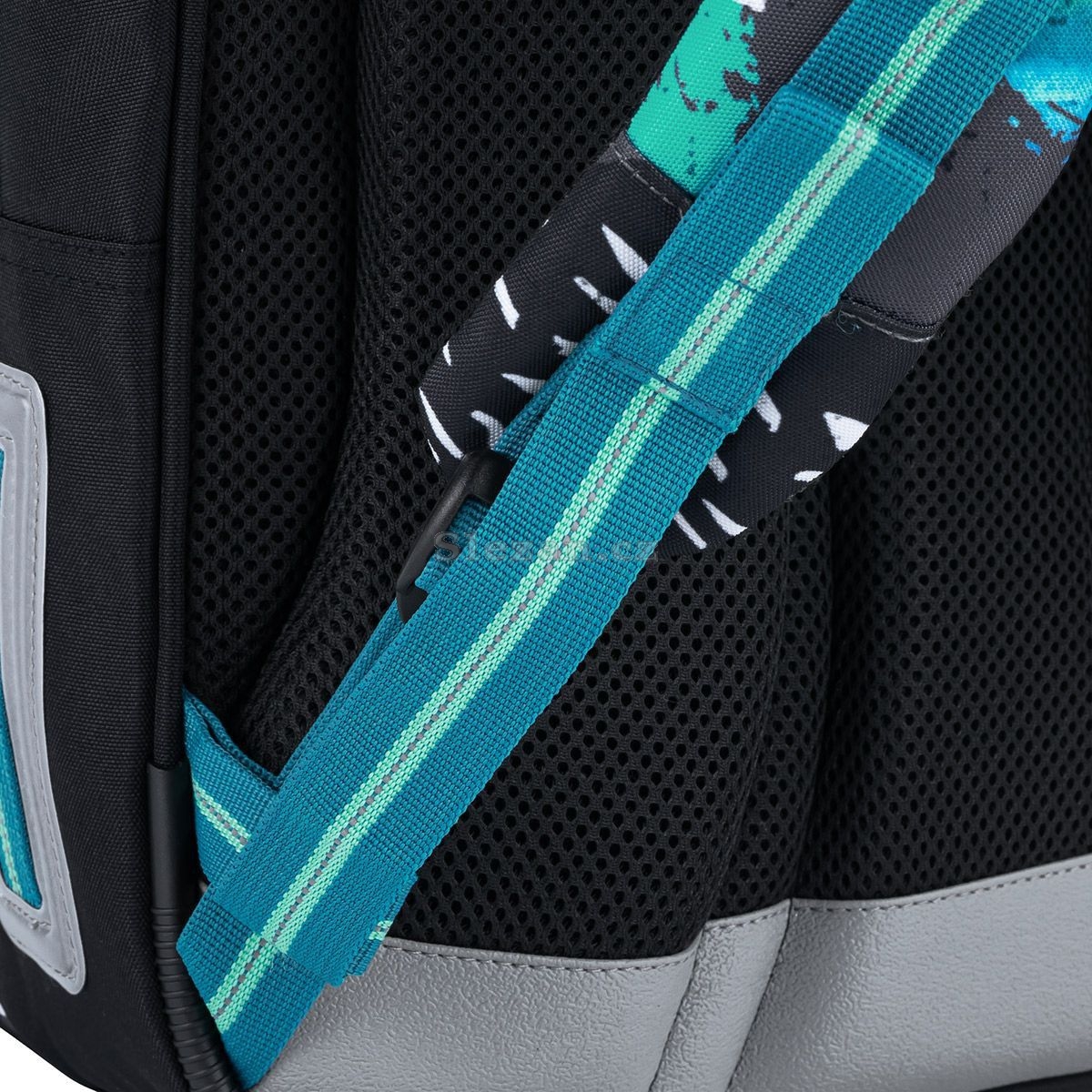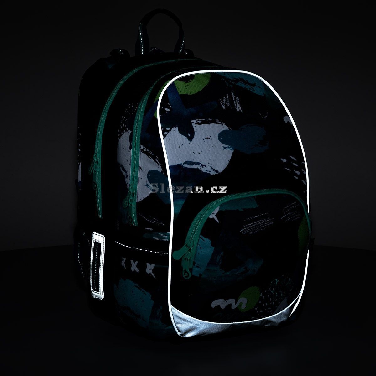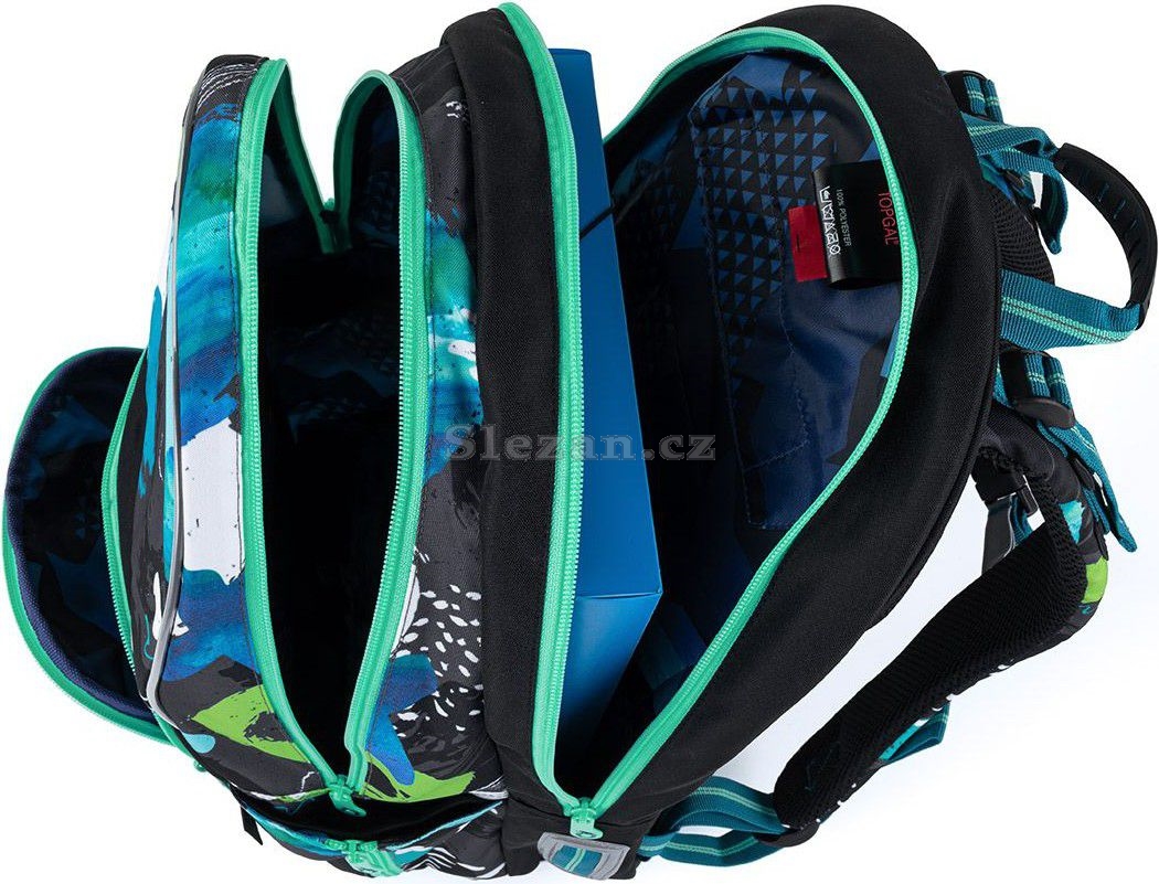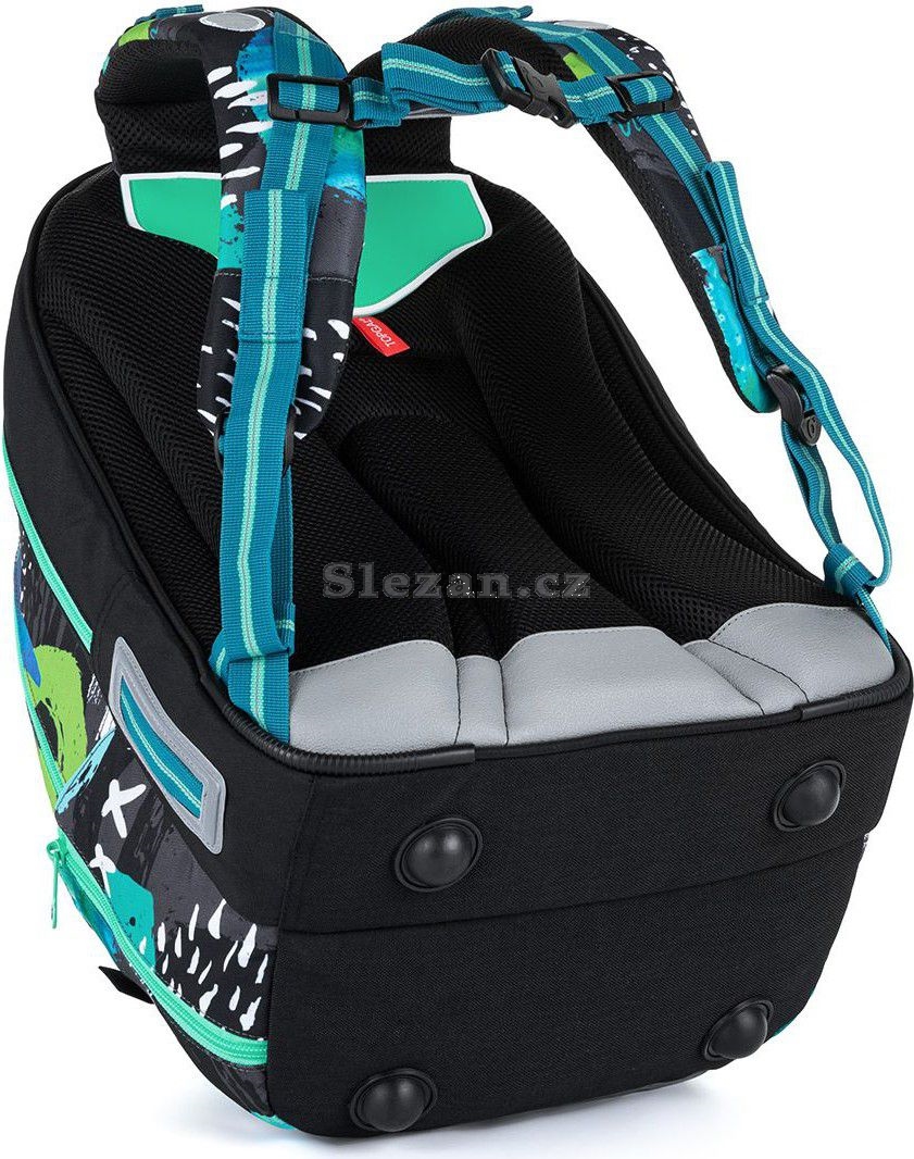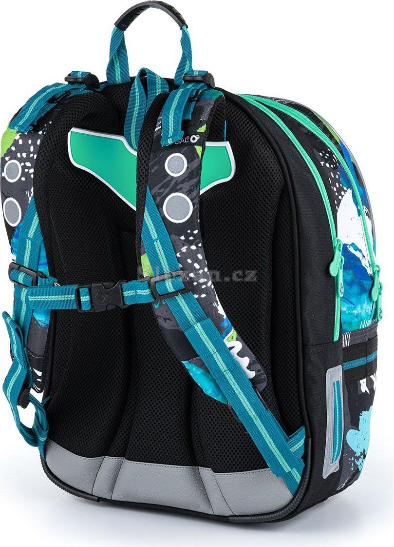 Spodní část popruhů můžete díky magnetu připnout k jejich polstrované části. Dvě hlavní komory jsou dost široké, objemné, pojmou všechno potřebné učení na prvním stupni ZŠ. Do zadní užší komory umístěte ty nejtěžší učebnice, atlasy, nebo desky na sešity. Přední komora je o něco širší než zadní, najdete v ní jmenovku a menší síťovou kapsu na zip.